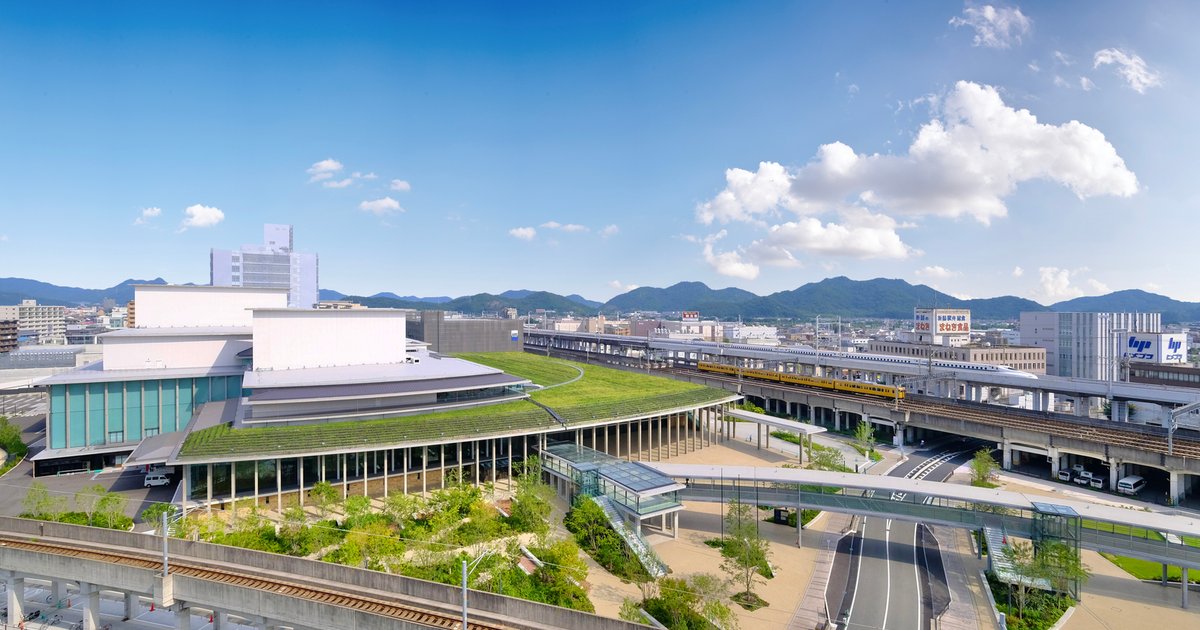 The facility features flexible exhibition halls, conference rooms, and performance spaces. Its 4,000 m² exhibition hall, with 10-meter ceilings and movable partitions, adapts for trade fairs, lectures, and events, connecting seamlessly with the adjacent outdoor park. The fourth-floor conference rooms overlook rooftop greenery and a courtyard, visually linking users with the surrounding cityscape and even Shinkansen bullet trains passing nearby, fostering a sense of urban connectivity.