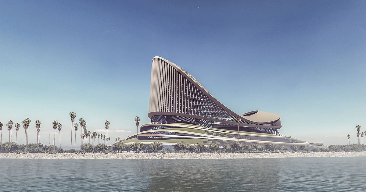 Strategically positioned off the coastline of Los Angeles, this futuristic architecture project boasts an expressive silhouette that ensures high visibility and a lasting impression. To promote sustainability, the southern section of the arena is equipped with solar panels, enabling an autonomous energy supply. The recreational area allows visitors to relax, explore scenic walkways, and rejuvenate amidst nature.