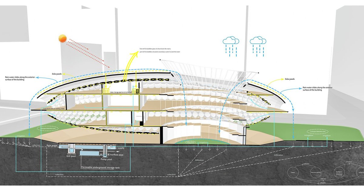 In the exploded view, one sees a thoughtful allocation of space by user group—children, staff, and parents—which supports independent movement while maintaining visual connectivity. The dome’s curvature optimizes air movement and allows rainwater to be collected, filtered, and stored below ground.