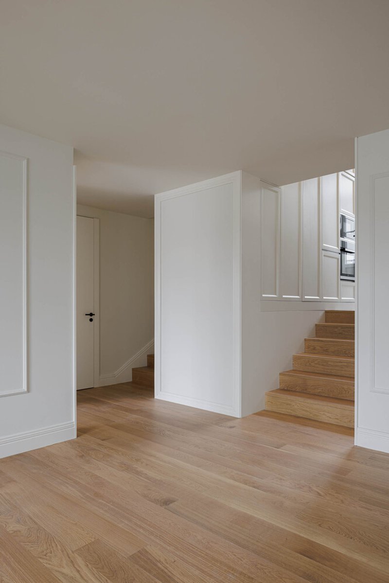 The existing high ceilings allowed for the creation of intermediate floors within the original volume, a subtle intervention visible only on the courtyard-facing facades. At the rear, the addition of a new floor required a careful façade redesign, balancing material selection and architectural language to ensure a harmonious yet modern expression.