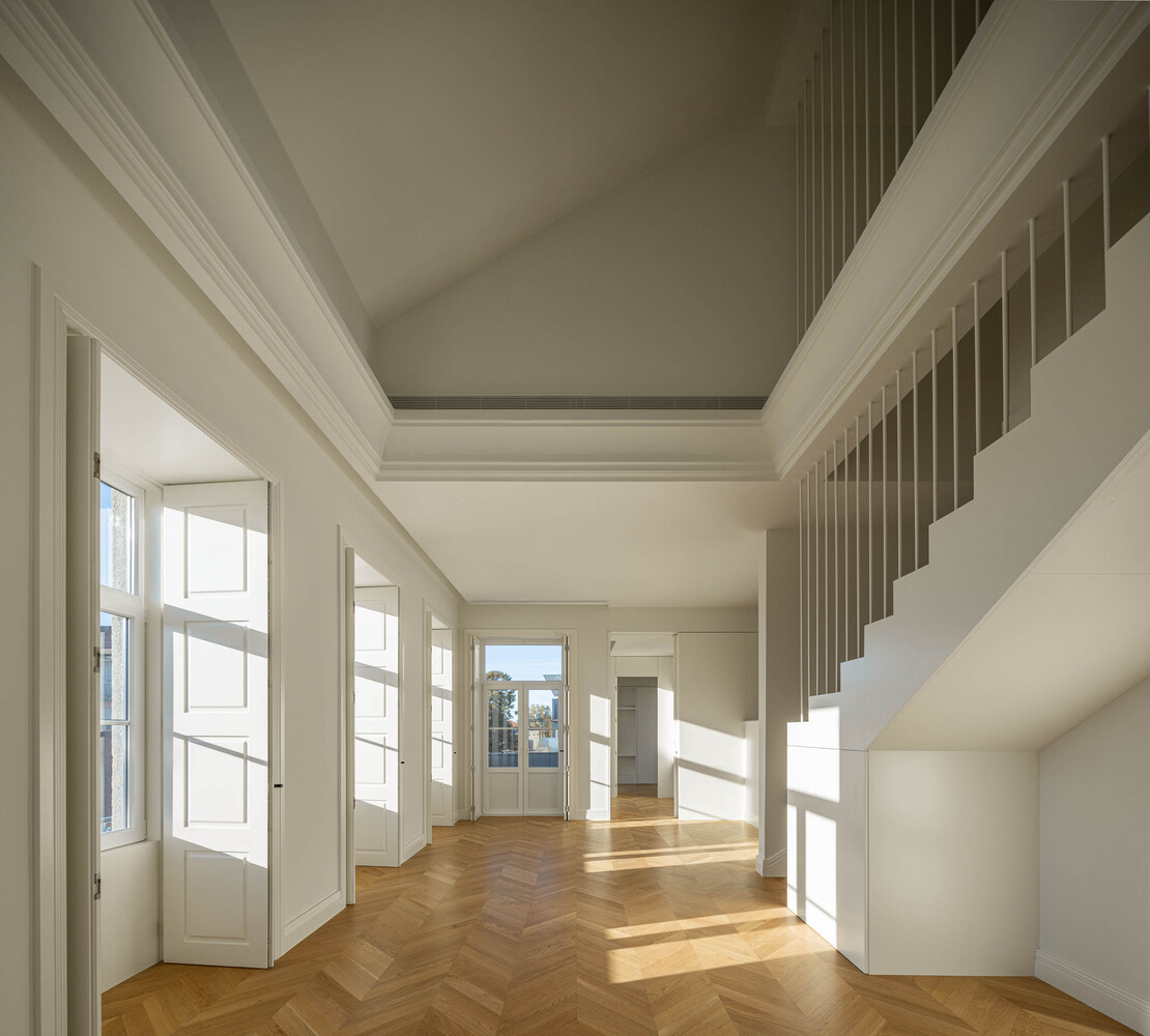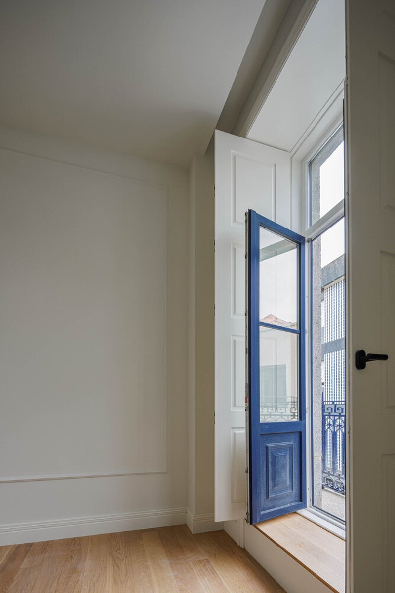 Photography by Ivo Tavares Studio captures the meticulous restoration and the seamless integration of modern architectural elements within a historic Porto context.