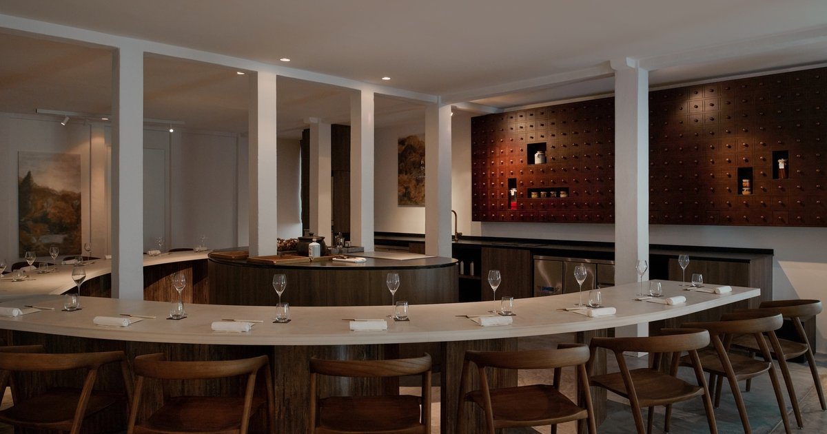 The architectural vision for ASU Restaurant Singapore draws from the dualities of light and shadow, old and new, presence and restraint. The interior design is conceived as a monastic retreat—calm, contemplative, and deeply connected to its historic context. The layout follows the logic of a theatre, where the open kitchen functions as the central stage. Two bespoke curved V-shaped dining tables arc around this focal point, creating a sense of audience engagement and intimacy.