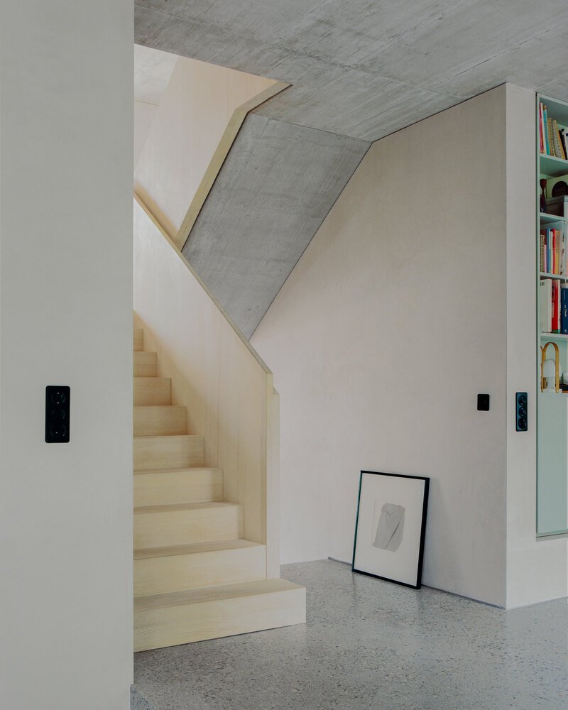 Together, these materials form a palette that is both minimalistic and warm, contrasting subtly with the spatial complexity of the layout. The result is a harmonious environment where craftsmanship, texture, and light shape the daily experience of the home.