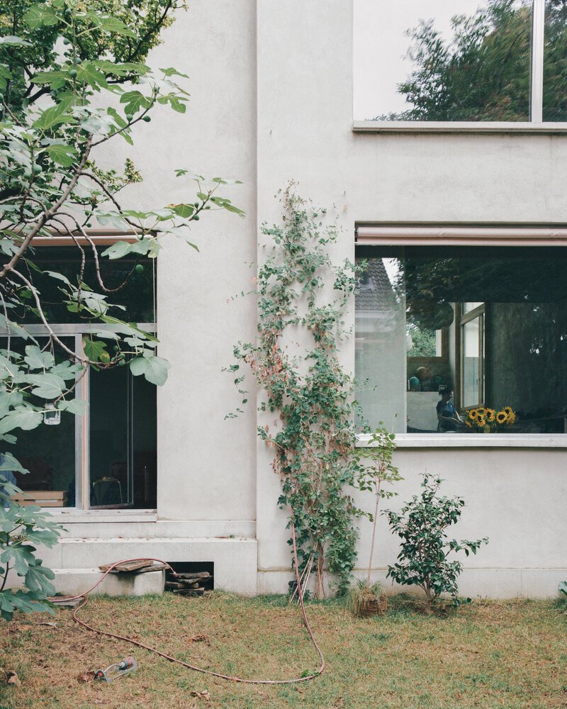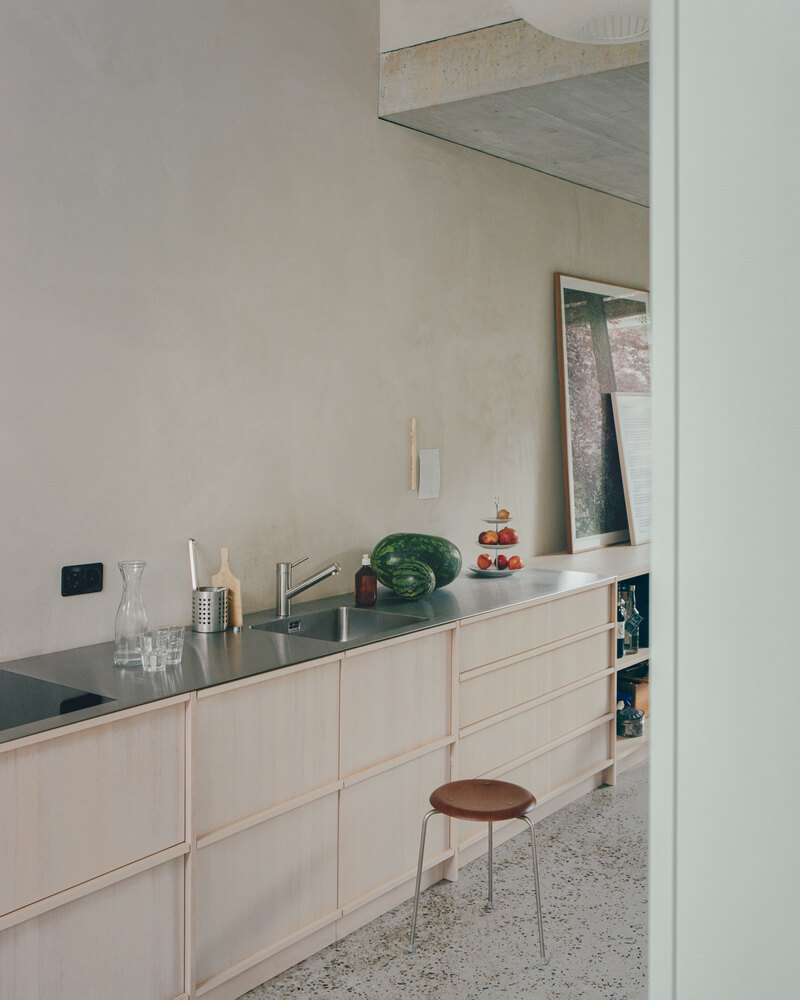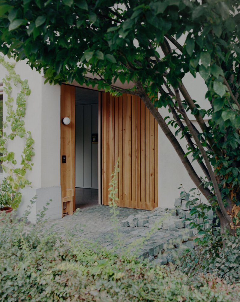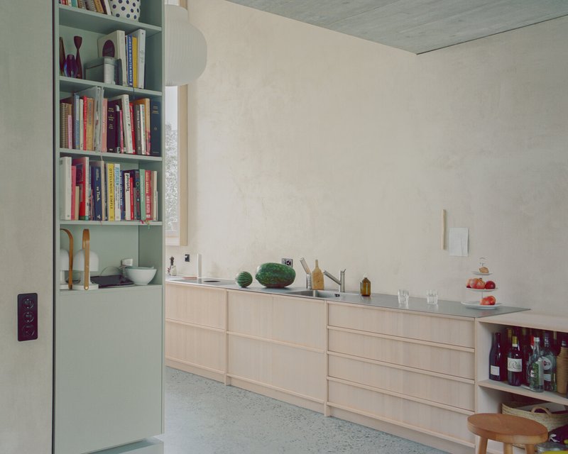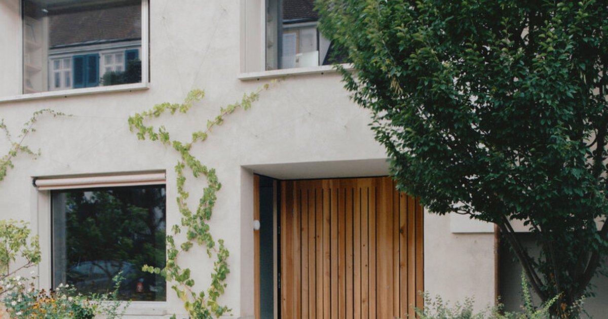 The new structure is thoughtfully positioned at the end of the plot, opening in three directions to optimize both natural light and contextual coherence. Its façade is defined by plastered single-leaf brickwork, arranged with a rhythm of regularly positioned windows featuring deep reveals that lend the exterior a sculptural depth. This construction logic not only gives the building a timeless quality but also ties it to the vernacular character of Basel’s residential streetscapes.