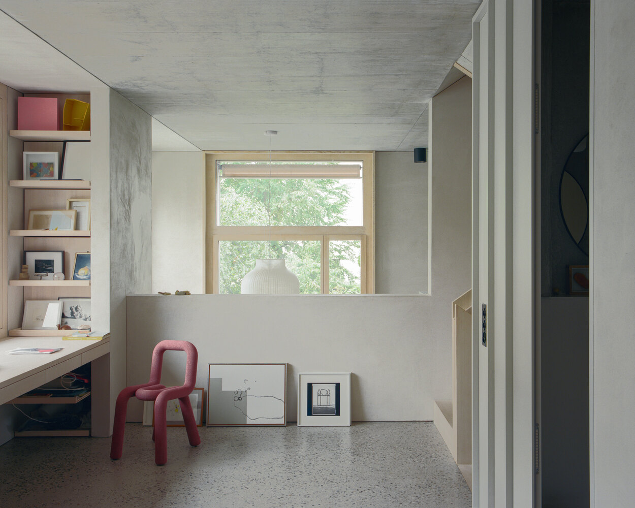 The ground and first floors combine workshop space, an entrance hall, dining area, kitchen, living zone, office, and communal room into a continuous spatial flow. This fluidity blurs the boundaries between working, living, and socializing, creating a dynamic interior that encourages movement and visual connection across two levels.