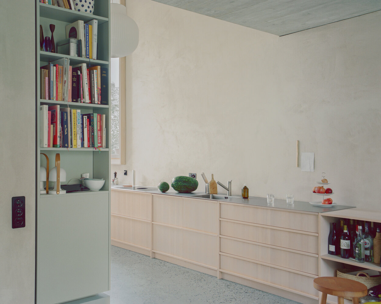 - Felt-brushed lime plaster walls, offering soft texture and diffused light.