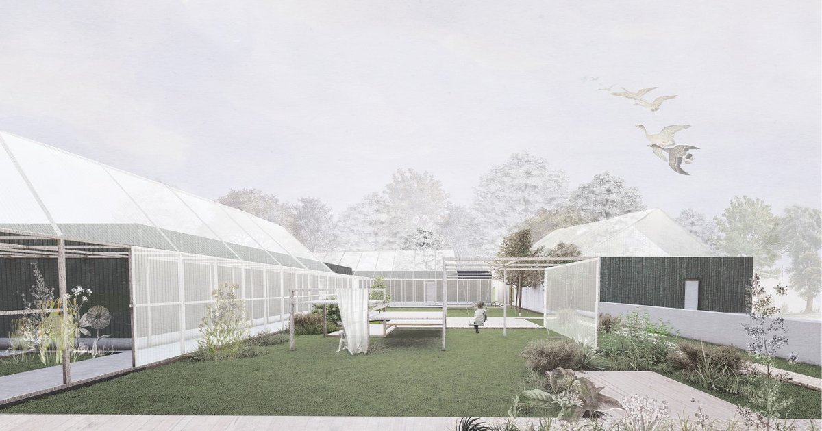 It is a ‘second skin’ surrounding the buildings and symbolizing the care given to children. It also provides a transition zone essential for acclimatization between spaces with divergent level of sensory control. Pavillon can be adjustable to different weather conditions by adding or removing polycarbonate panels. Material has been chosen on the basis of its thermal properties and light filtering. Additionaly it is very light, so can be moved easily. It is also considered as a occassion for development of the buildings - the space above the box buildings, but belowed the sloping roofs of pavillon, can be used as space for garden with vegetables or as space accomodated for volunteers working in the centre.