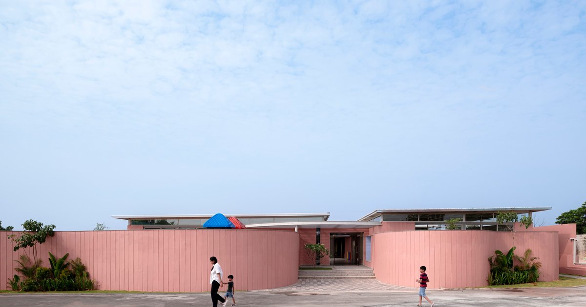 The campus sits on a 1.9-acre linear site stretching south to north, bordered by a main road to the south and a by-lane to the west. The northern half is devoted to playgrounds and outdoor activities, while the southern half houses the school.
