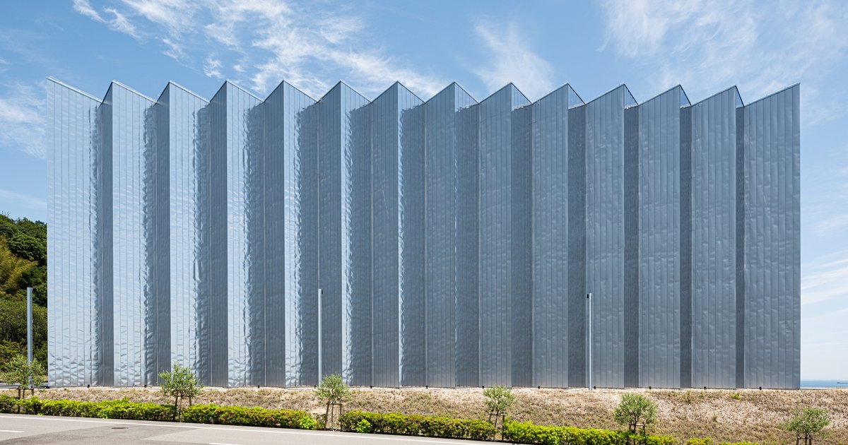 Awaji Factory by OHArchitecture features a pleated steel facade, column-free truss structure, and dynamic design reflecting industrial innovation in Japan.