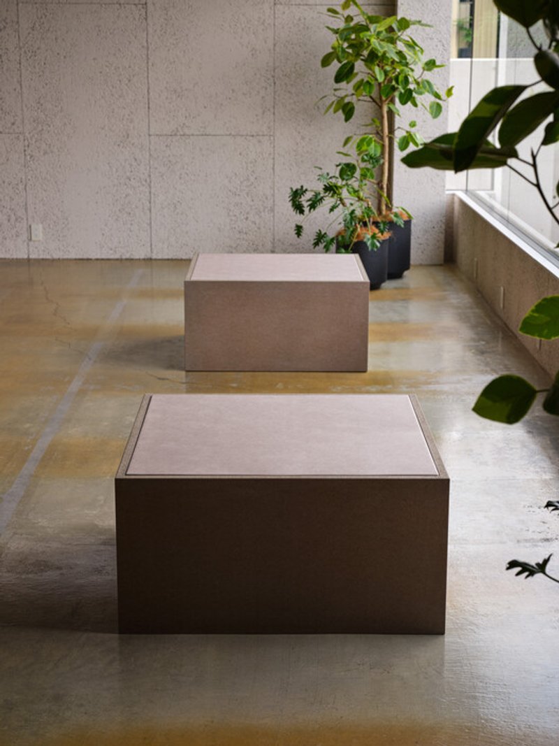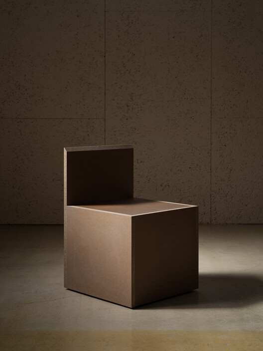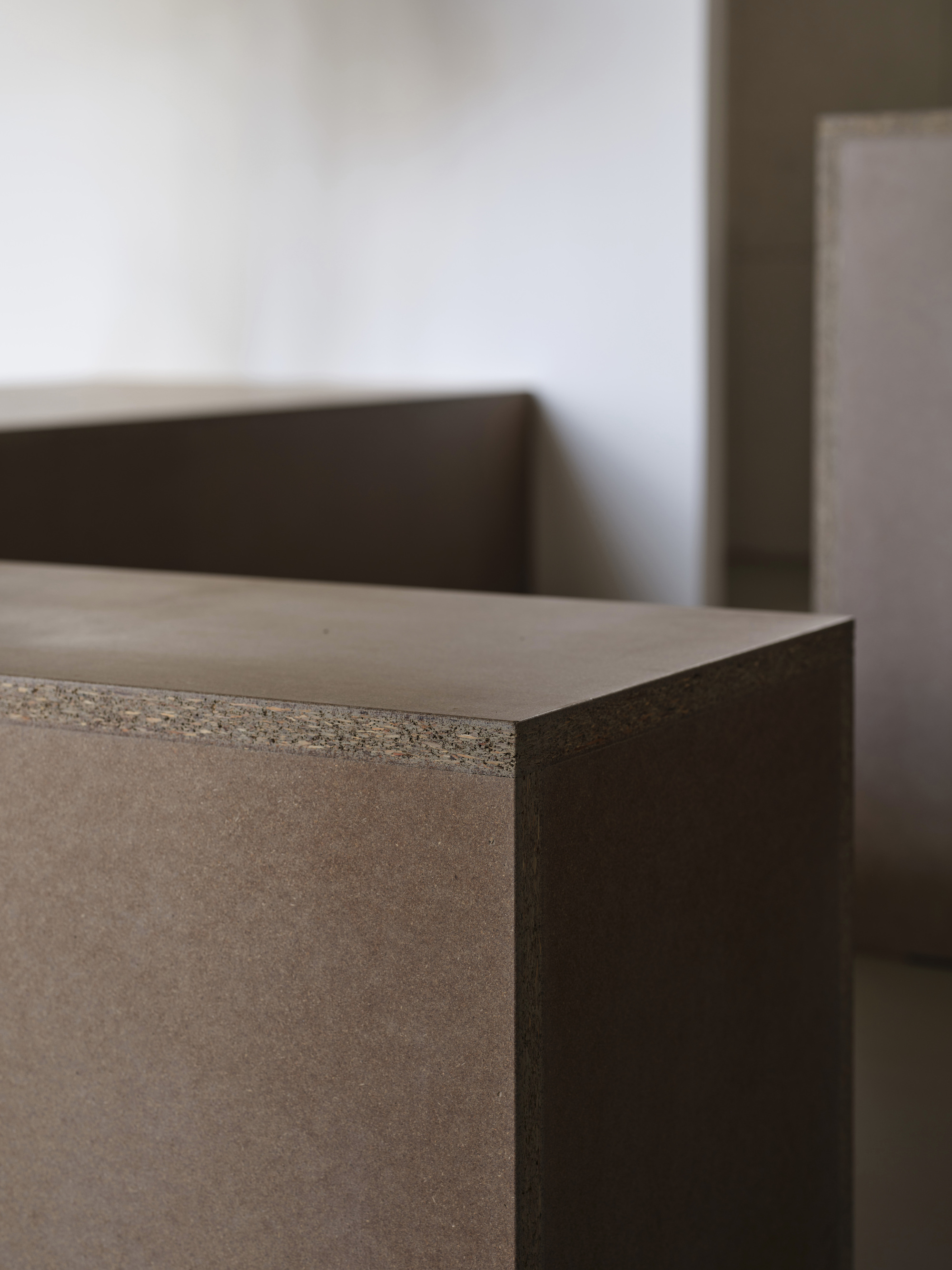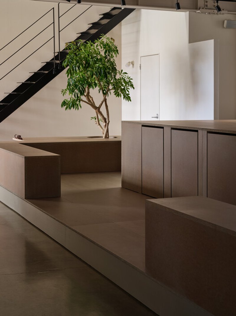 At the center of the office, a large table and integrated benches anchor the space, creating a tactile sense of groundedness. Constructed from layered, naturally pigmented particle boards and concrete-inspired textures, the centerpiece serves as both functional workspace and symbolic mass, emphasizing the connection between human activity and the physical world.