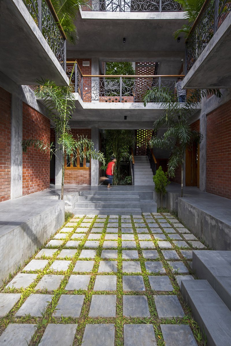 The central courtyard is a pivotal element in the home’s design, providing visual connectivity between the interior spaces and the surrounding nature. This open space allows natural light to flood the building while offering a relaxing outdoor retreat for the family. The design incorporates terrace gardens and strategically placed bamboo trees, creating a lush green environment that extends the living space beyond the walls of the home.