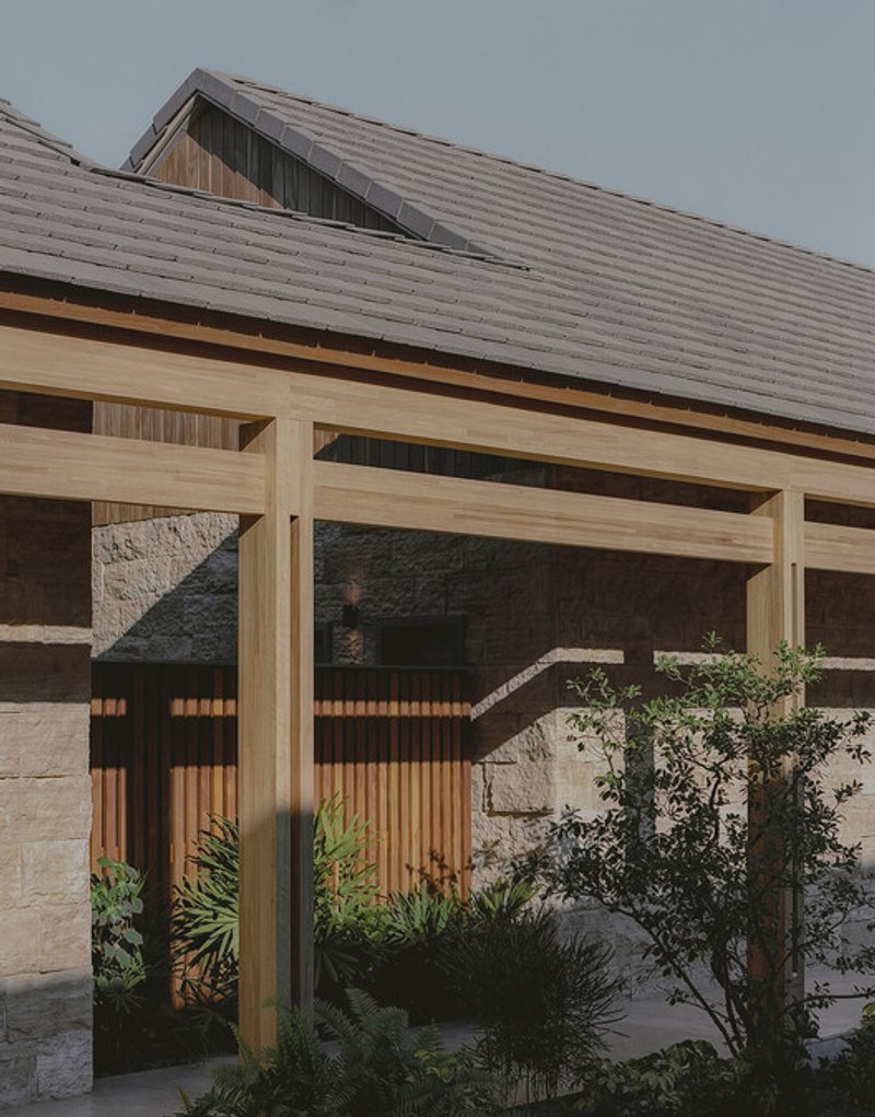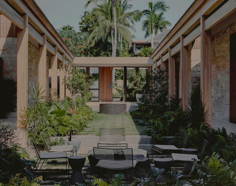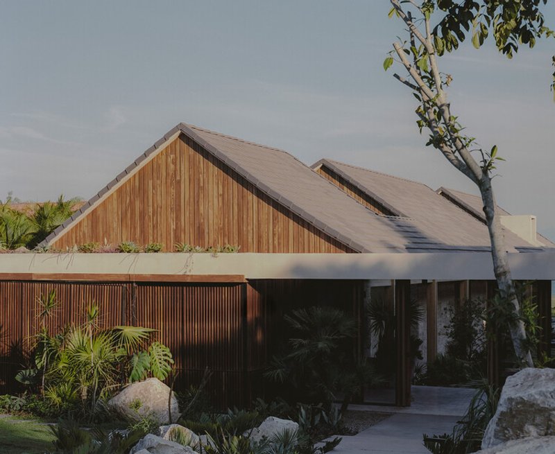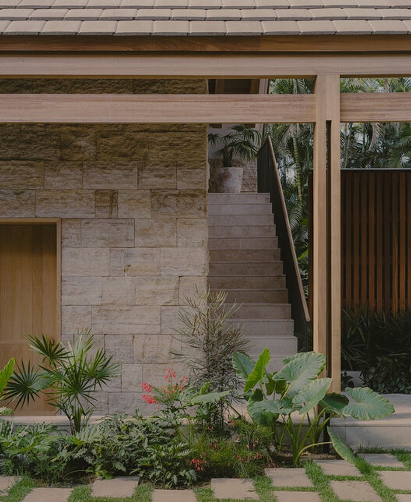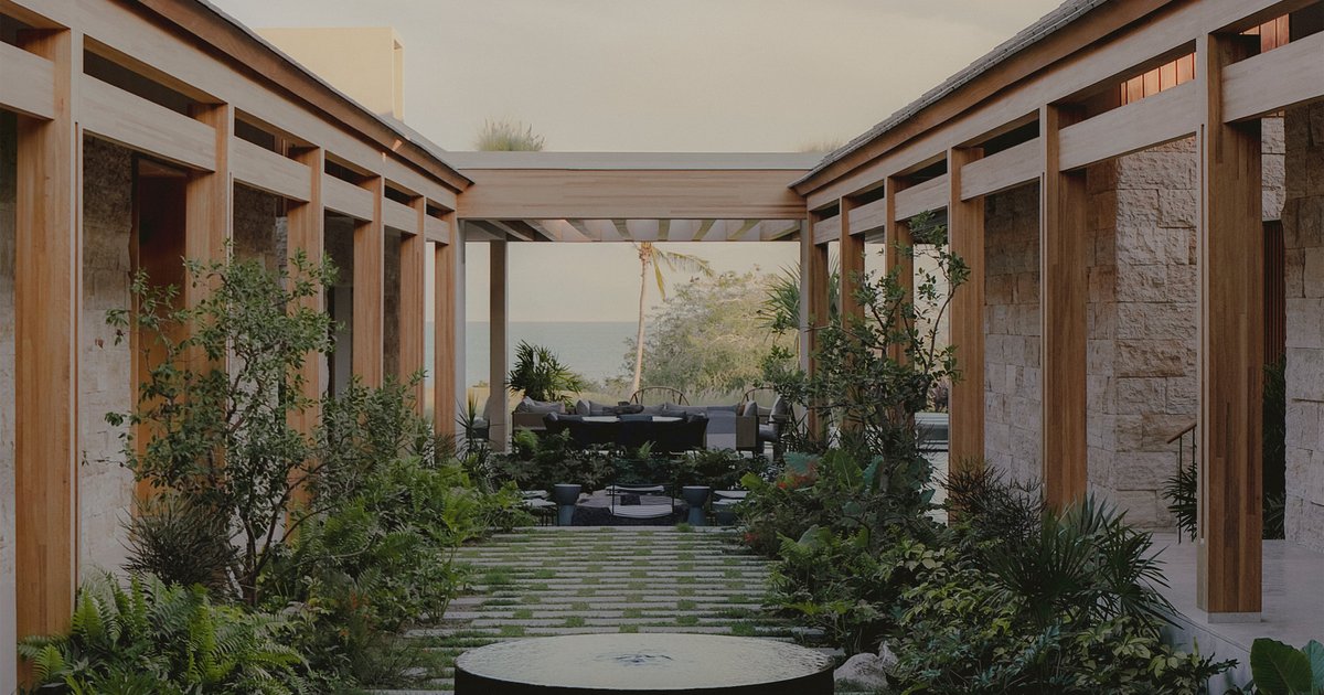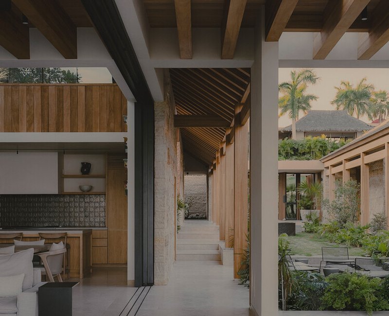 The community’s requirement for sloped roofs became an opportunity to reinterpret traditional Mexican architecture through a minimalist lens. The house’s gabled wooden roofs, paired with porticos and open corridors, blur the boundaries between interior and exterior, inviting fluid transitions between garden, patio, and sea. The structure’s rhythm of slender timber columns creates a light, graceful silhouette that merges harmoniously with the tropical surroundings.
