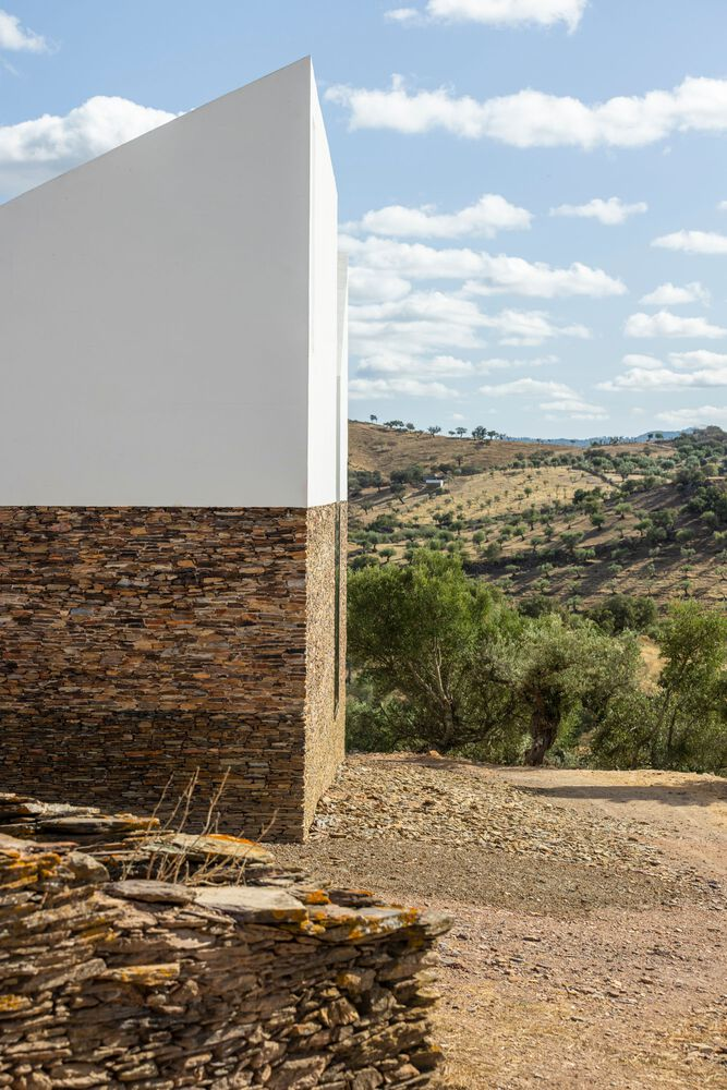 The design emphasizes continuity with local construction culture, using white-painted surfaces in contrast with schist stone and on-site wood. This approach honors Alentejo’s architectural memory, supports small local economies, and maintains a connection with Barrancos’ heritage. The building is conceived as “built with the landscape,” blending modern architectural principles with traditional materials and techniques.