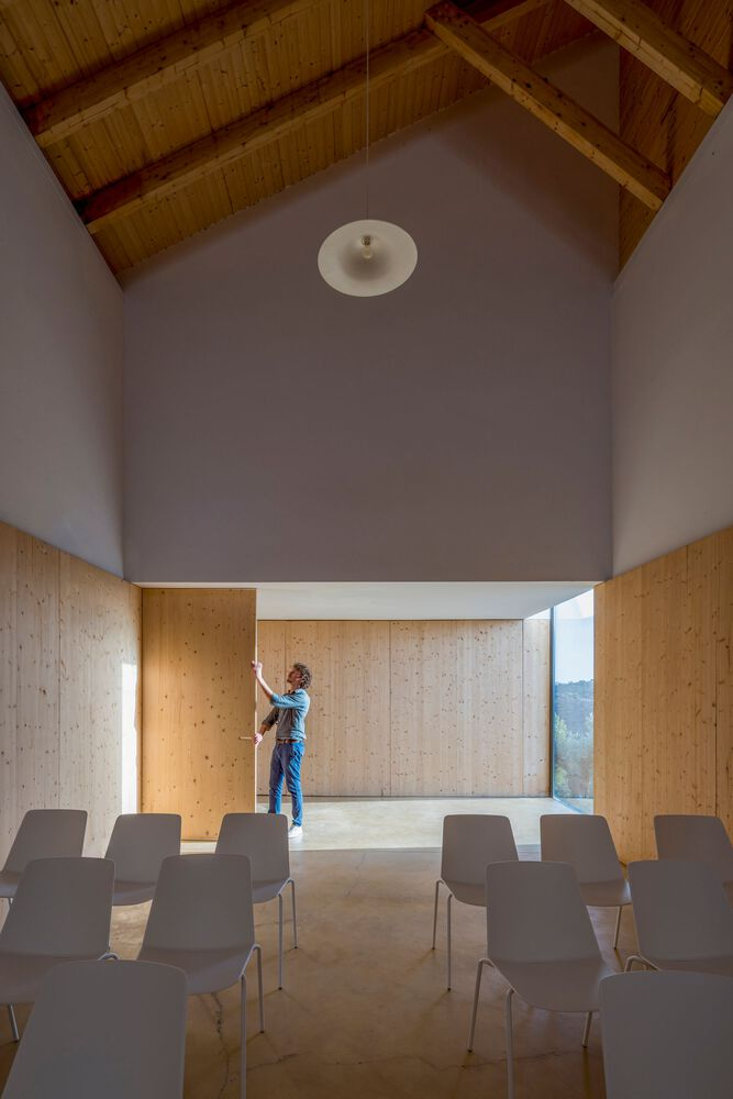 Inside, the chapels are designed to interact with natural light dynamically, changing throughout the day and across seasons. The flexible seating system and integrated furniture accommodate differentiated ceremonies, allowing the chapels to merge for larger gatherings. Materials like wood, concrete, and local schist reinforce a tactile and serene atmosphere while reflecting the local vernacular architecture.