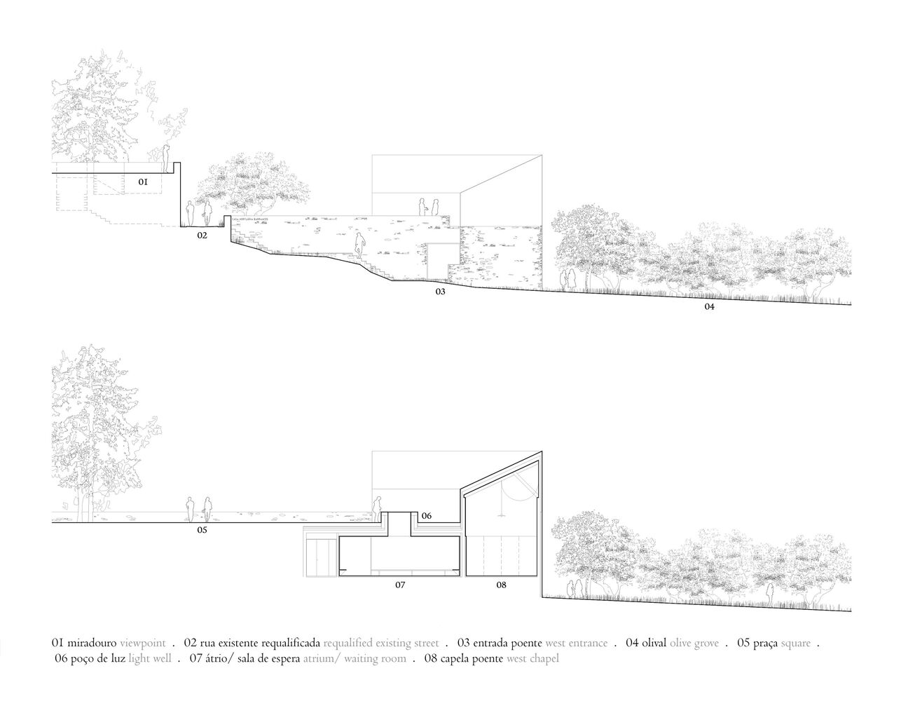 The building’s layout progresses from a public square overlooking the landscape to a schist stone foundation supporting white funeral chapels, a reflective water tank, and a luminous atrium. The atrium functions as a central distribution space, connecting public areas—such as chapels, restrooms, and kitchenette—with service areas, including storage and facilities for the worship leader. Interior spaces are carefully arranged to promote calmness, privacy, and contemplation.