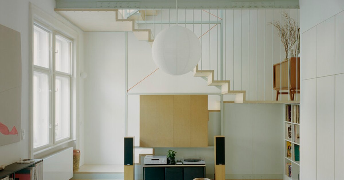 One of the project’s most technically innovative features is the staircase. Due to the limitations of the historic slab, the stairs could not be supported directly on the floor. Instead, they are suspended from steel beams mounted on the walls, creating a floating structure that appears to hover within the space. This solution not only resolves structural challenges but also becomes a striking architectural element.