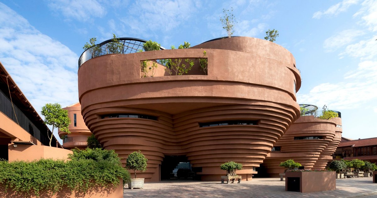The five-story structure is a striking fusion of traditional pottery techniques and contemporary design. Inspired by the dynamic movement of a ceramic artisan shaping clay, the building is formed by seven interlocking ceramic wheels, creating a fluid yet functional layout. The structure also recalls the imagery of Bat Trang’s historic gourd-shaped kilns, blending modern innovation with heritage.