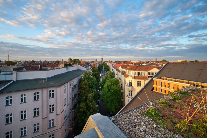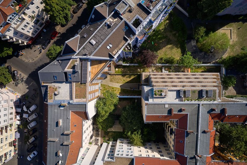 The site prioritizes green communal spaces. Private gardens are partitioned by planted borders, and vertical surfaces are densely planted with edible plants. Roof terraces on both buildings provide panoramic views down Pannierstraße toward Görlitzer Park, encouraging social interaction and community cohesion.