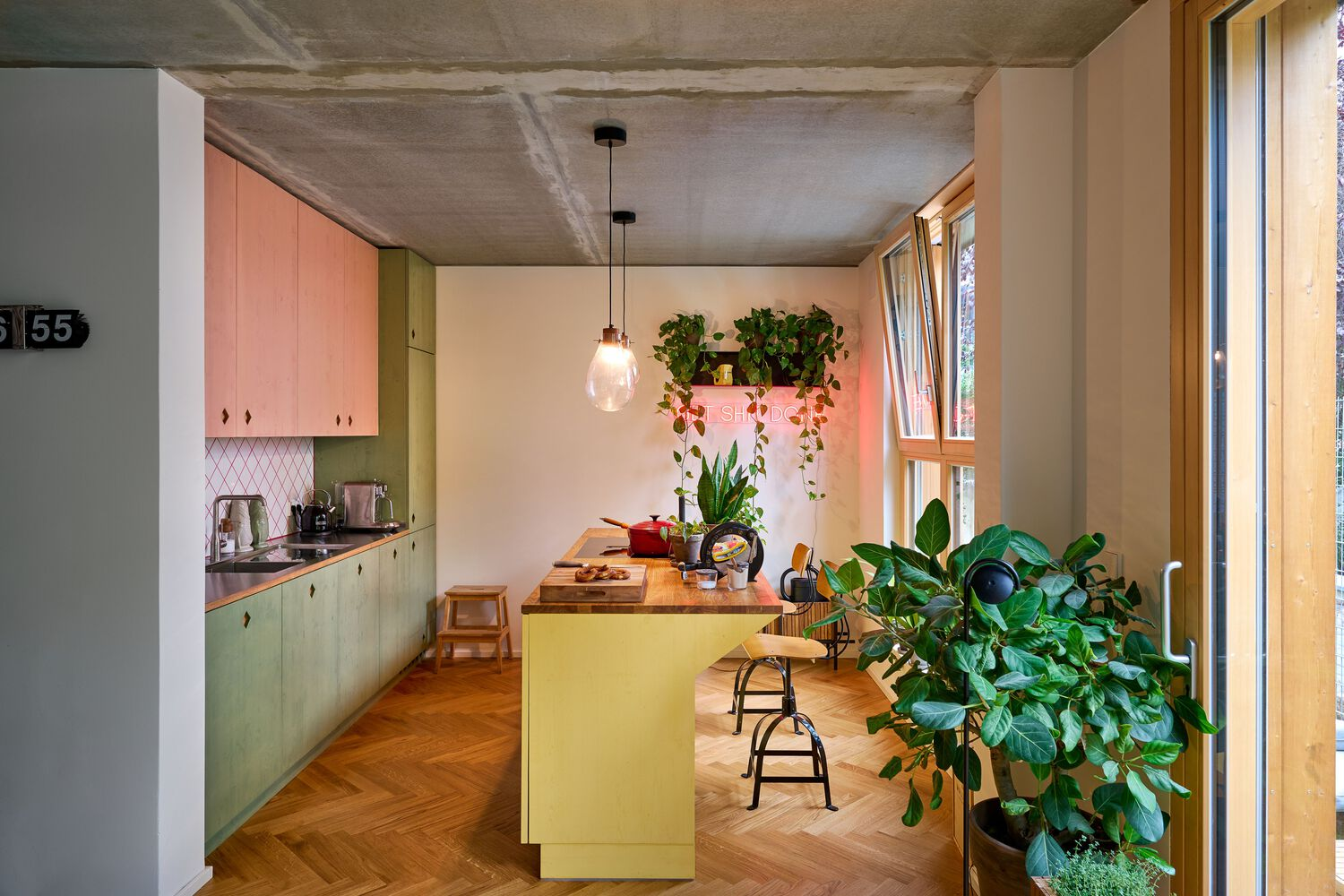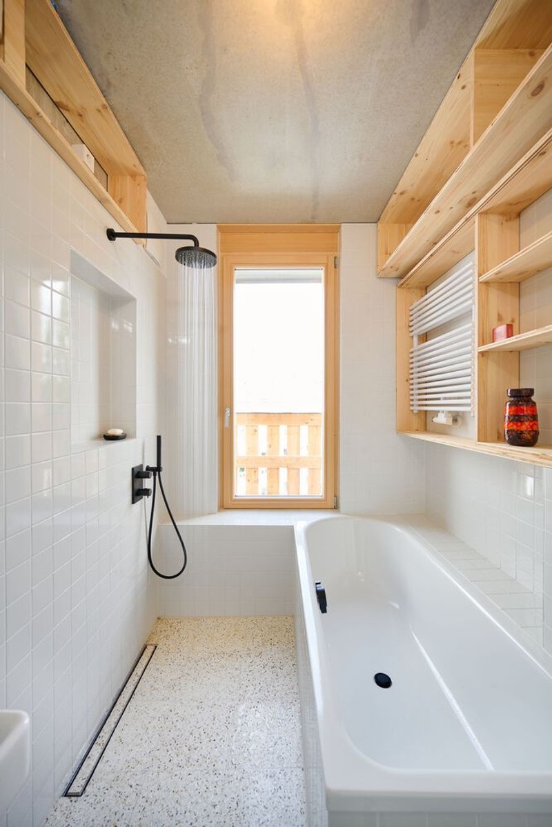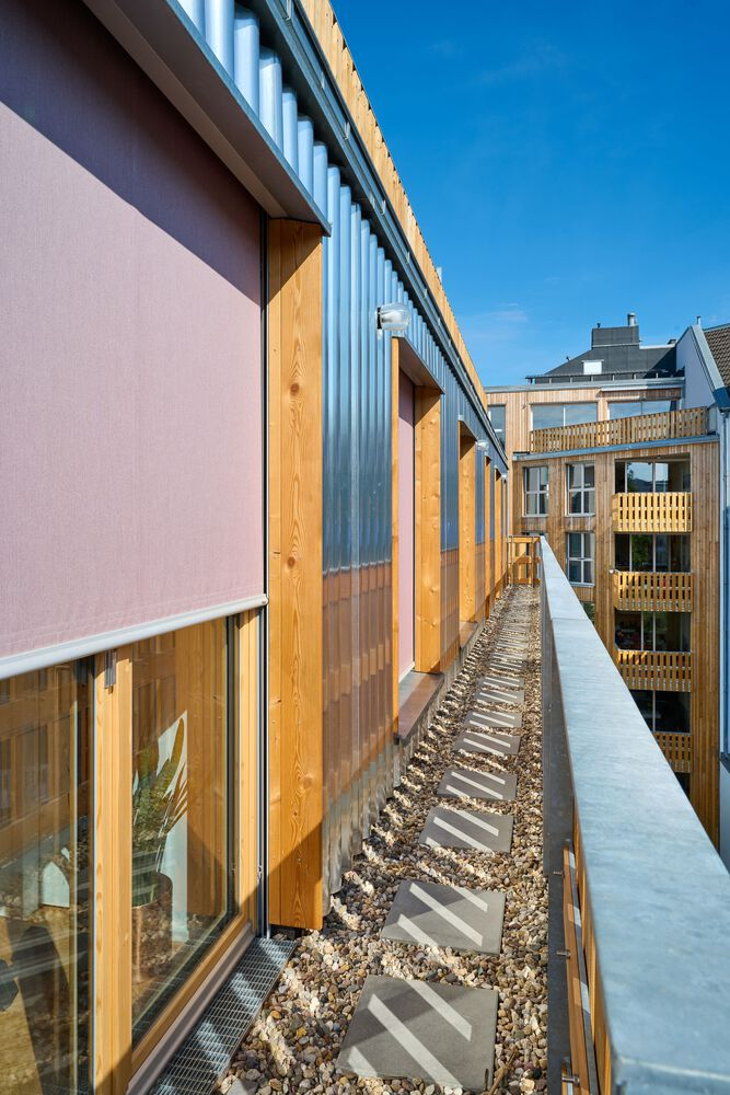 Interiors of the apartments were co-designed with residents, offering freedom in flooring, kitchen, and bathroom finishes. Apartments in the front building feature loggia-style balconies, combining shelter with openness, while maisonettes in the garden house include large wooden lift-and-slide doors to enhance indoor-outdoor living. IFUB* designed kitchens and staircases using healthy materials like spruce treated with linseed oil and oiled oak, integrating thoughtful details and sustainable finishes.