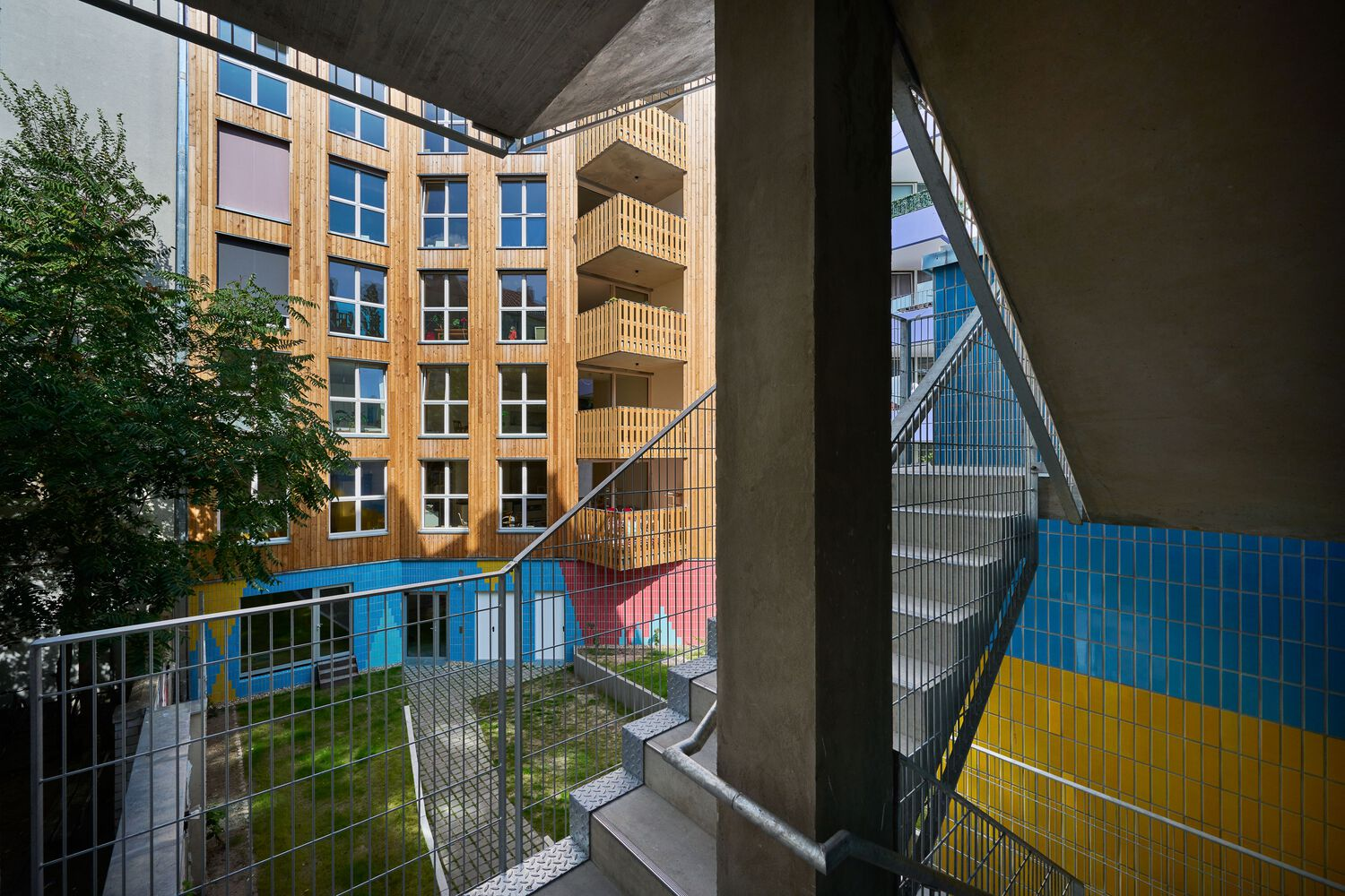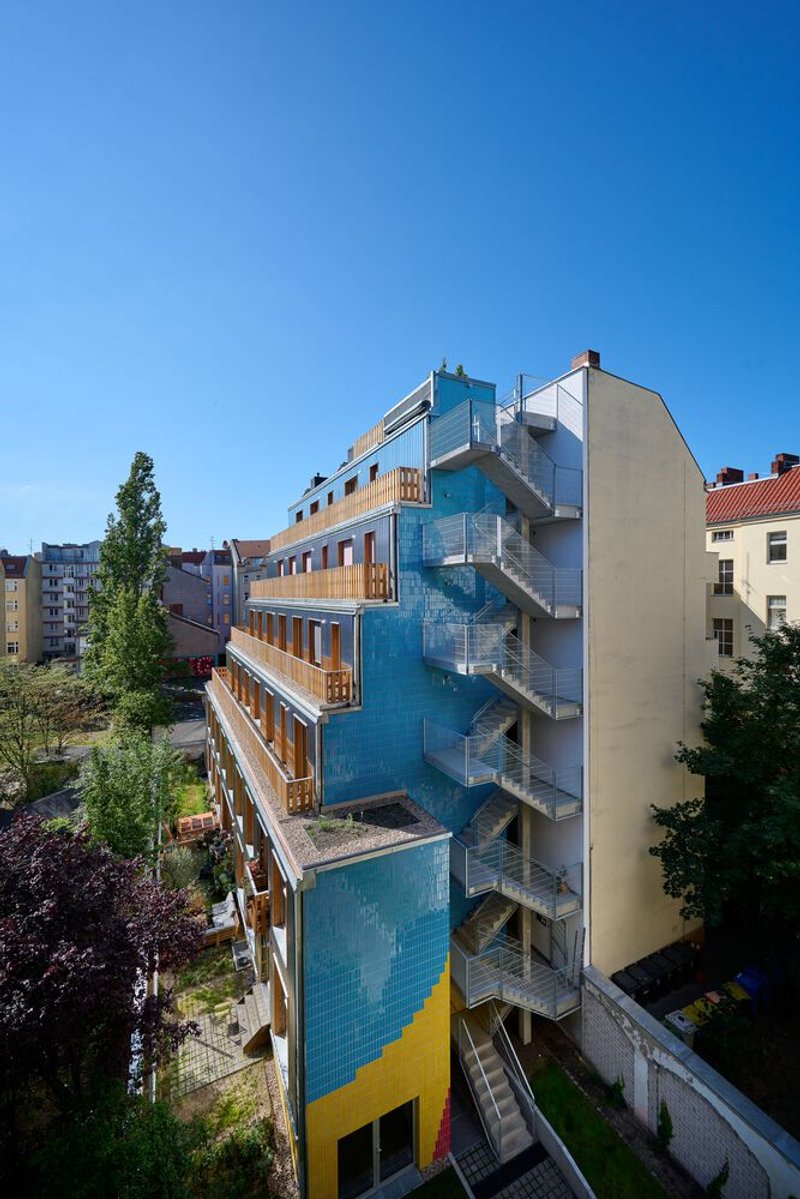 The colorful glazed clinker bricks reference 1970s Neukölln facades and link the front building to the garden house at the rear. South-facing balconies and terraces maximize natural light and outdoor access, while flexible apartment layouts allow units to be combined or subdivided, ensuring long-term adaptability.