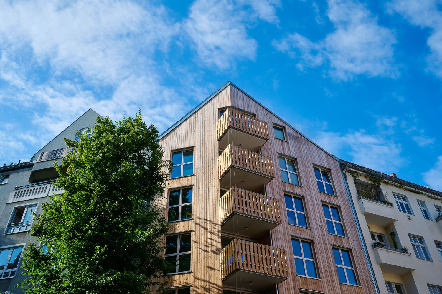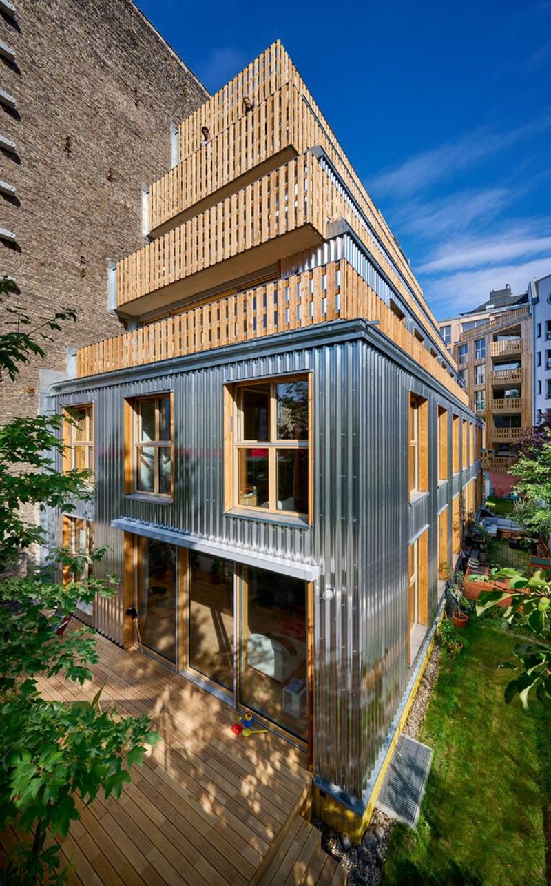 Sustainability is central to Baugruppe D2. The project uses a hybrid construction method, combining solid structures with timber-based enclosures to meet sound insulation and fire safety standards. The front building features larch wood cladding with jointless panels, complemented by white-glazed wooden windows and galvanized steel flashing. The garden house uses aluminum panels and glazed clinker bricks for non-combustible facades. Local materials, including the Berliner clinker brick slips, ensure a minimal ecological footprint.