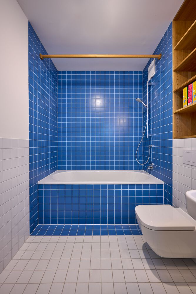 Bathrooms reflect individual preferences, with vertical 10x30 cm tiles in gradient colors, colored niches, and combinations of terrazzo floors with black or white fixtures. Each apartment balances functionality with aesthetic appeal, promoting comfort, flexibility, and durability.