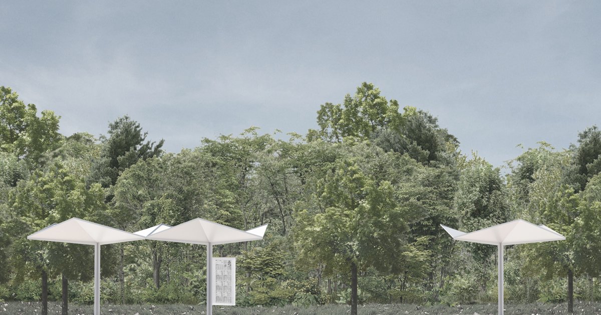 Form follows function and every part of the structure has its purpose. The design reflects the true nature of the material. Sheets of steal are prefolded to make for stability and shape. Six equivalent parts are attached to each other with screws. Their shape and geometry is the same. By turning one part upwards and the next one downwards, the geometry of the assembled structure forms an umbrella-like roof for the busstop.