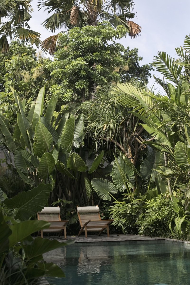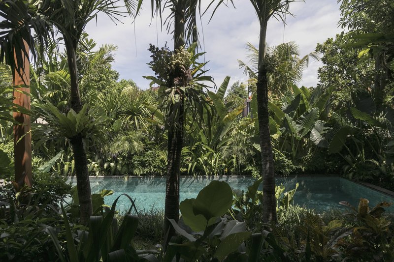 The vibrant garden not only enhances the aesthetic appeal but also plays a crucial role in the local ecosystem. It attracts wildlife back to the land and creates a microclimate that helps cool the site during Bali's hottest months. The garden's design incorporates vertical lines, with the highest building enveloped in a canopy of trees that spirals down to broad tropical leaves surrounding the swimming pool.