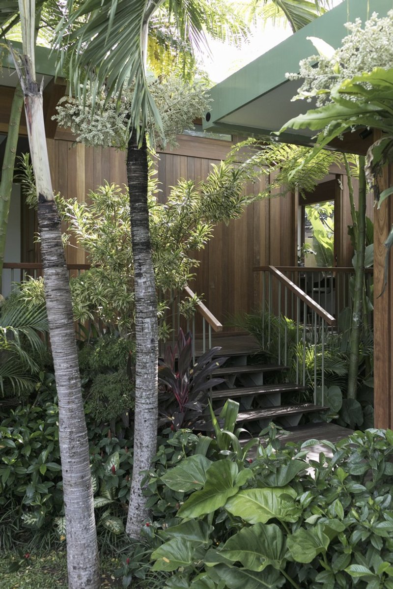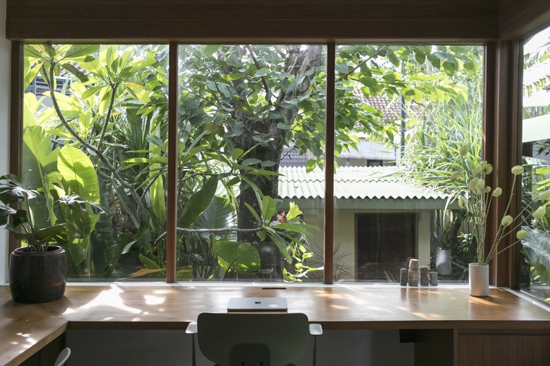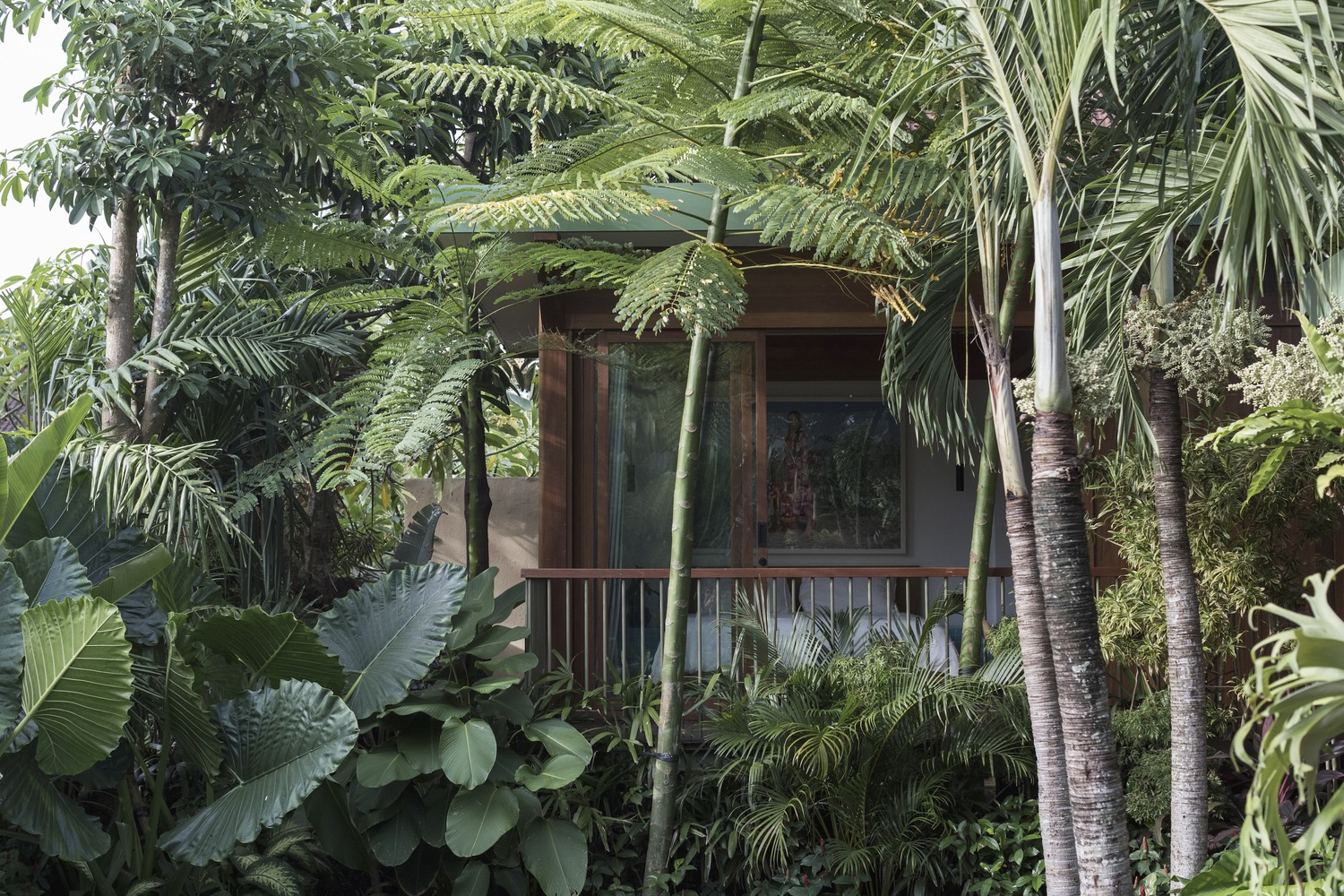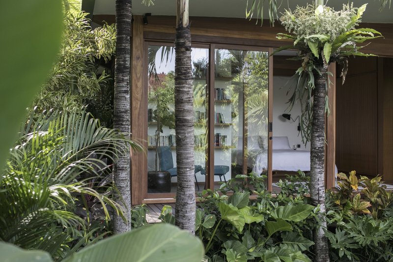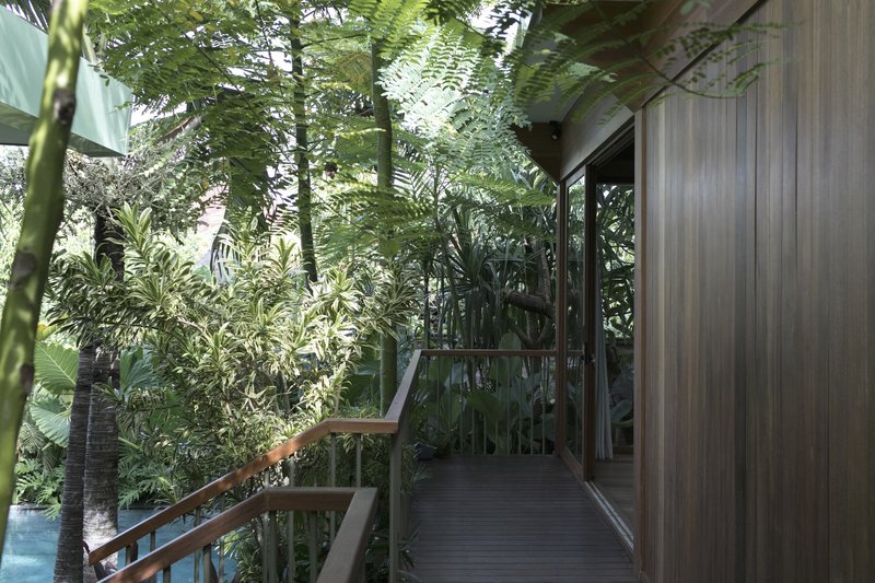 Bali Landscape Company has transformed the surroundings of Bawa House into a lush tropical garden. The landscaping features a play with vertical space, with buildings positioned at varying heights to create dynamic perspectives. Trees and plants fill the areas between buildings, making the house appear as though it is floating amidst greenery.