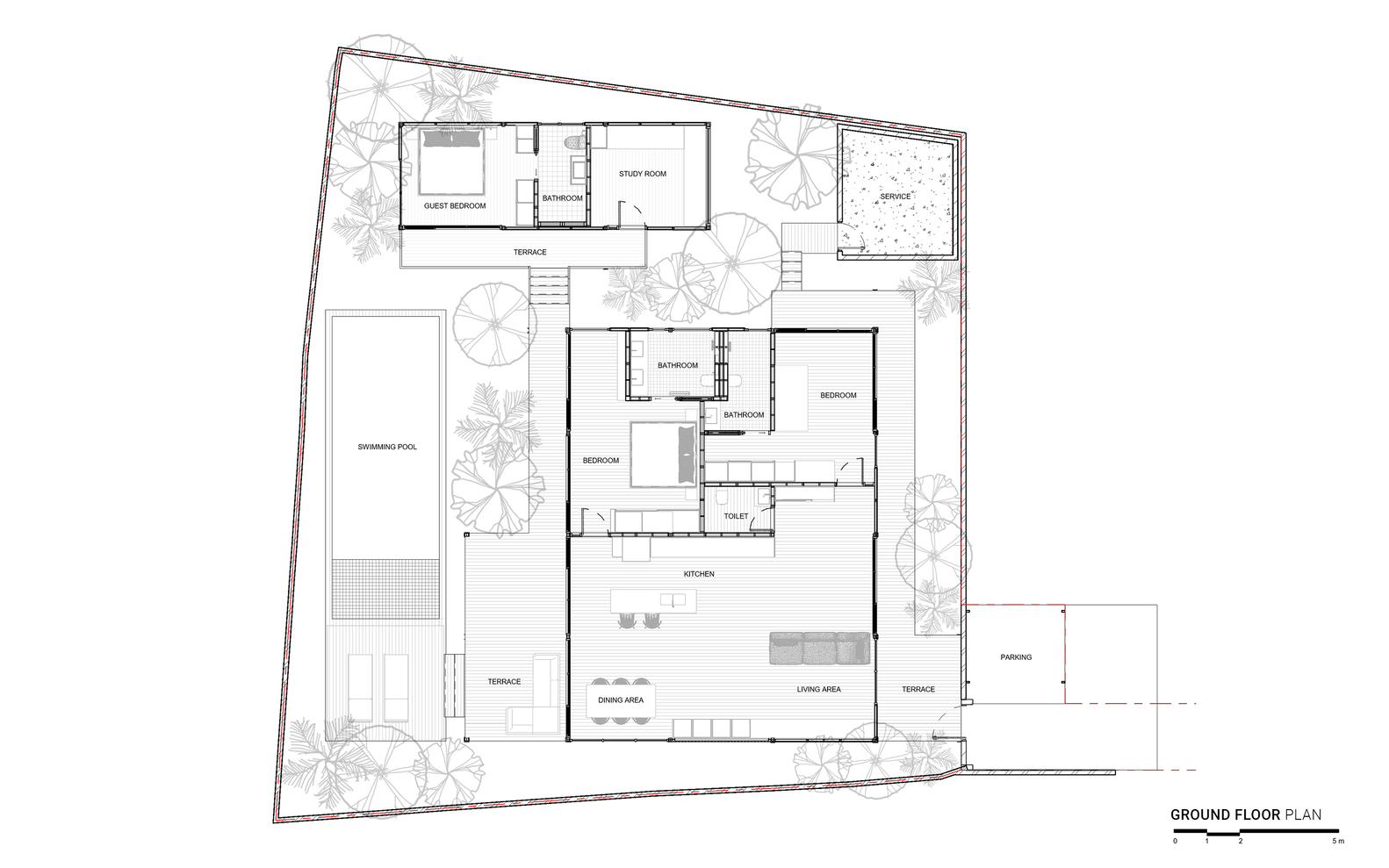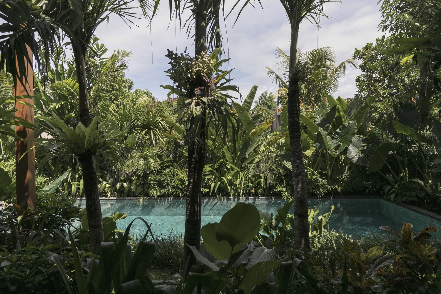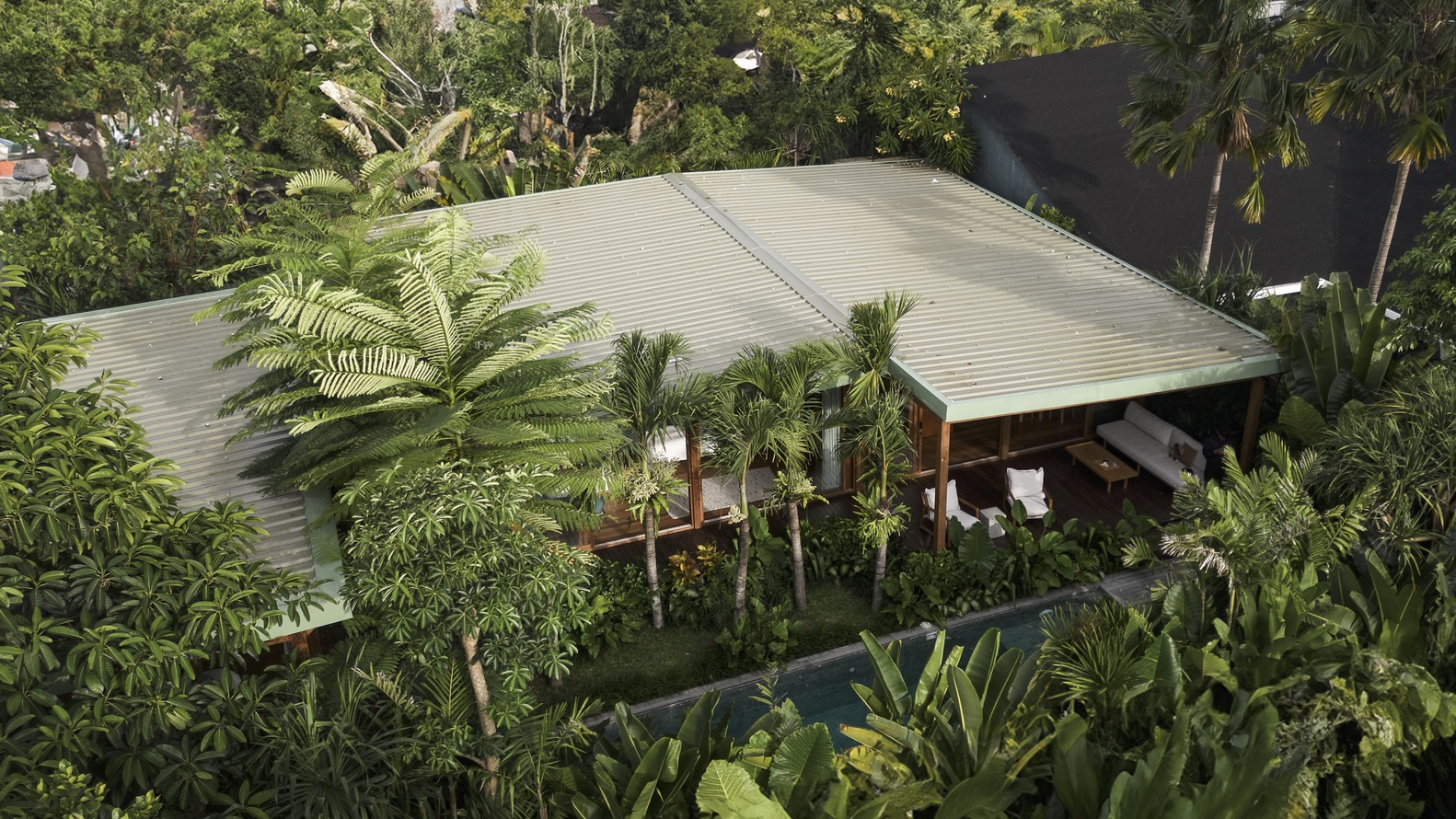 Bali Landscape Company has transformed the surroundings of Bawa House into a lush tropical garden. The landscaping features a play with vertical space, with buildings positioned at varying heights to create dynamic perspectives. Trees and plants fill the areas between buildings, making the house appear as though it is floating amidst greenery.