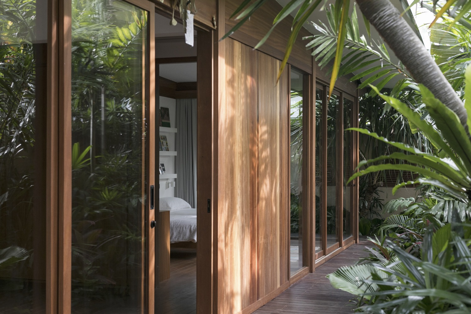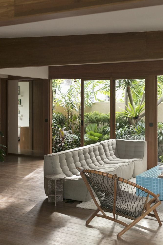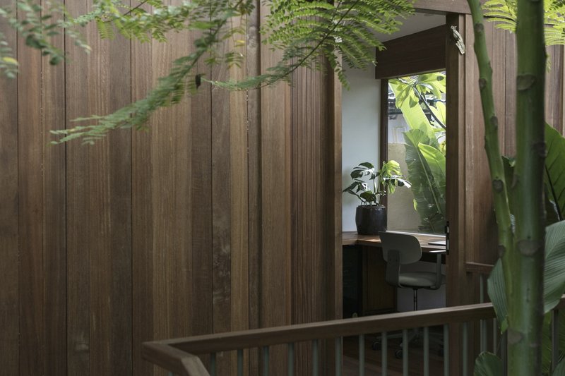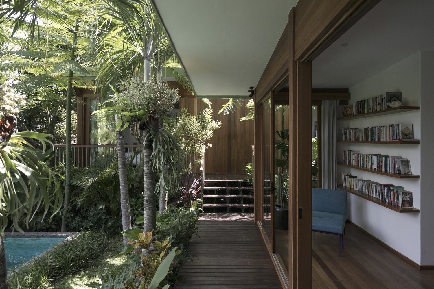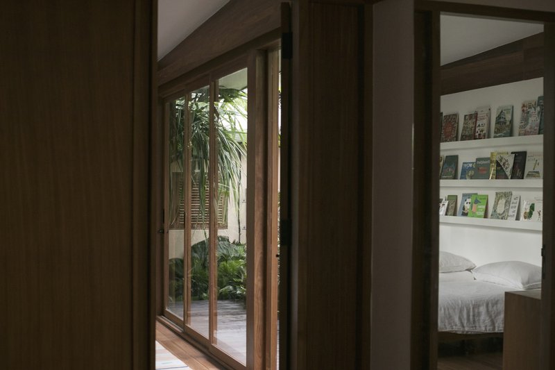 Interior design by Atacass Design Studio emphasizes functionality and elegance. The use of natural materials and simple lines creates a calming atmosphere. Elevated wooden walkways connect different parts of the house, extending the living area and providing long lines of sight that enhance the feeling of spaciousness on the compact site.