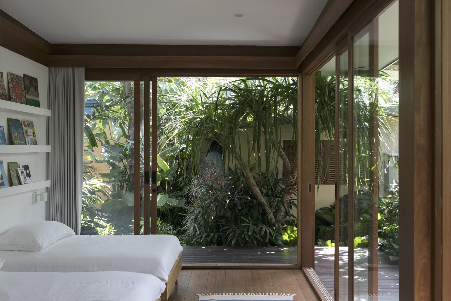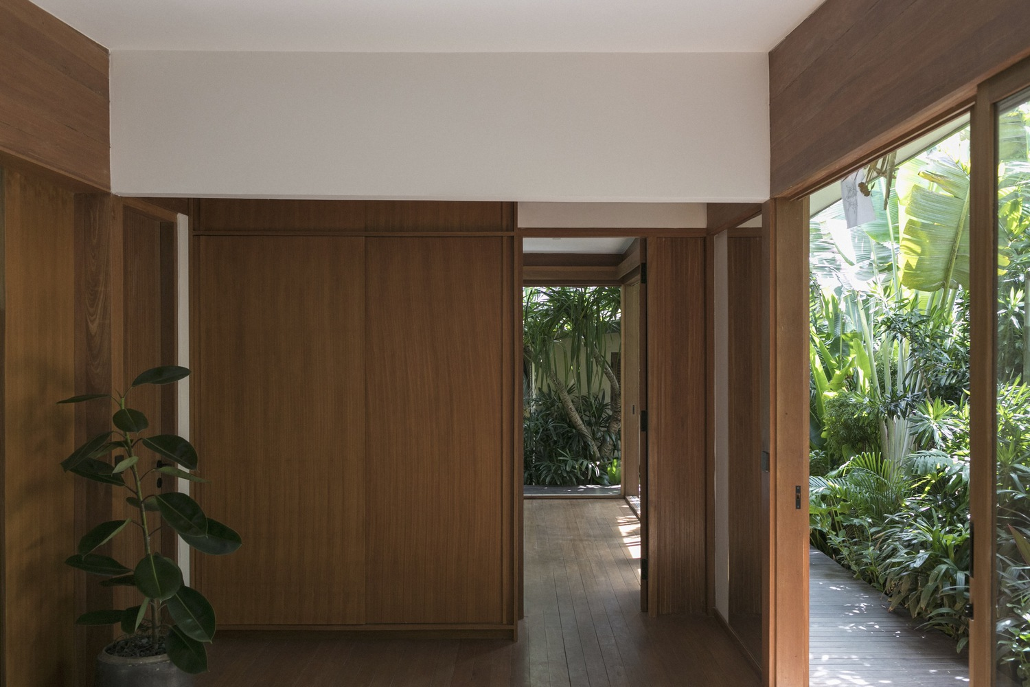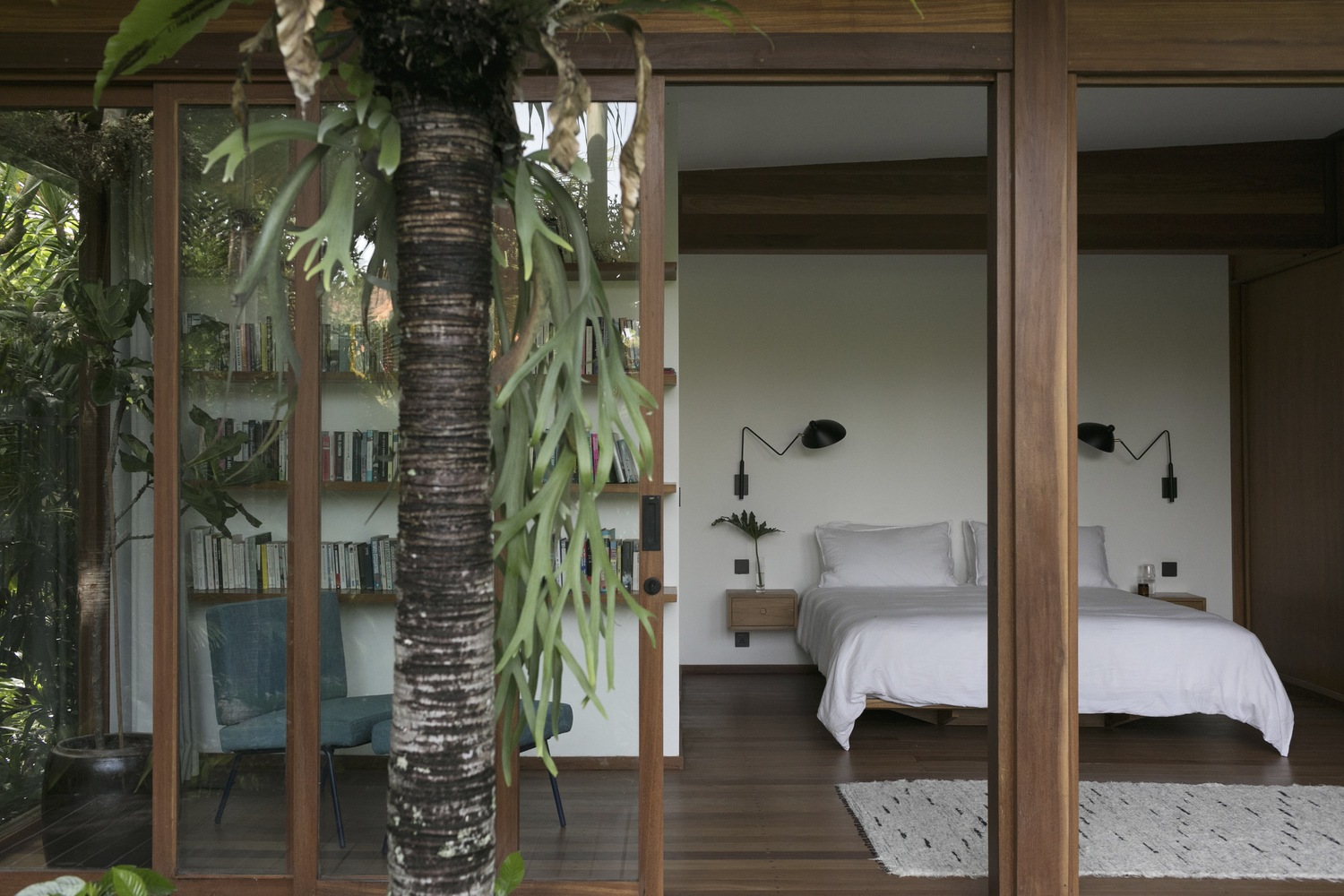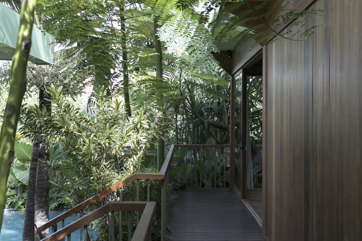 Interior design by Atacass Design Studio emphasizes functionality and elegance. The use of natural materials and simple lines creates a calming atmosphere. Elevated wooden walkways connect different parts of the house, extending the living area and providing long lines of sight that enhance the feeling of spaciousness on the compact site.