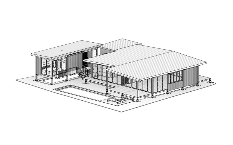 The minimalist family home comprises a main living area, three bedrooms, and an office, each designed to connect seamlessly with the outdoors. The design minimizes solid walls, opting instead for large sliding doors and floor-to-ceiling windows that flood the interiors with natural light. This openness creates a sense of space and continuity, blurring the lines between indoor and outdoor living.