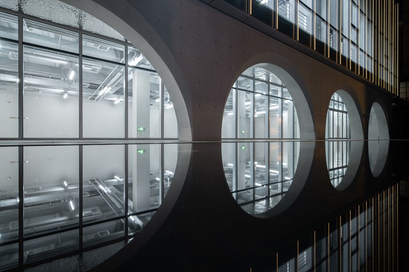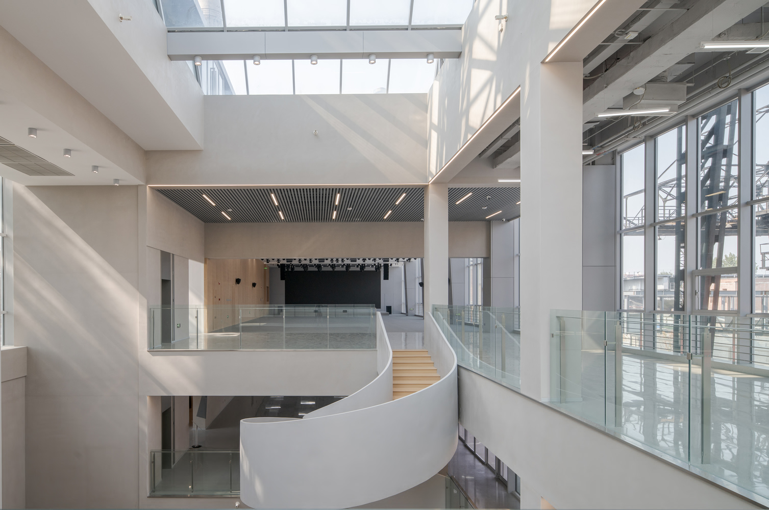 The design team carved out half of the ground floor to achieve a triple-height transparent atrium, forming a nearly unobstructed visual axis across the building. This openness allows the surrounding industrial landscape to penetrate deeply into the interior, transforming machinery, cranes, and pipes into unexpected architectural backdrops.