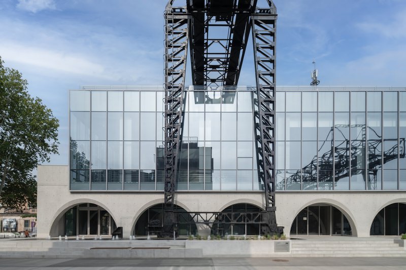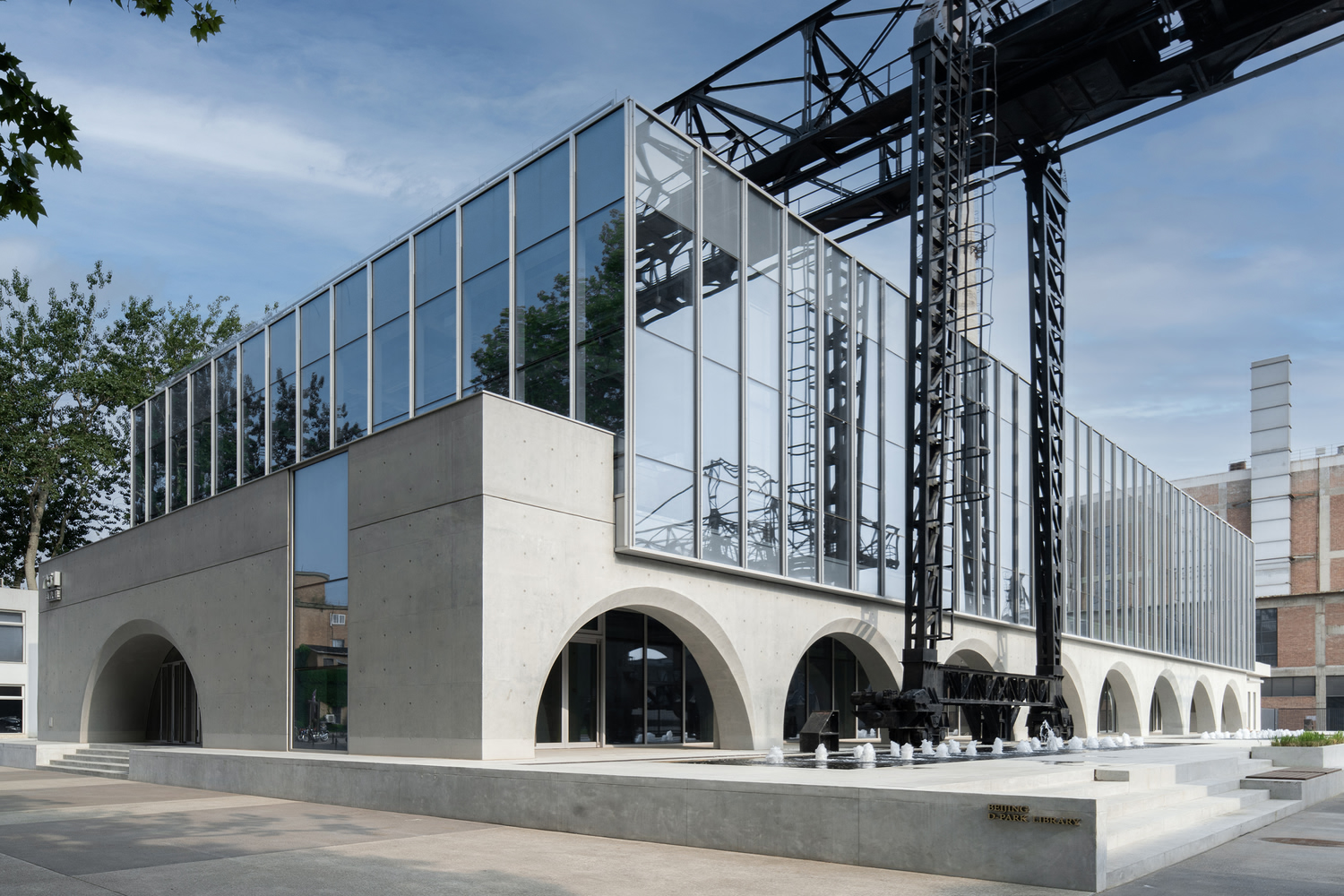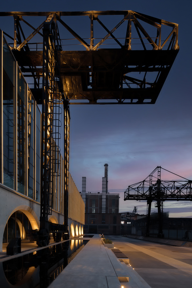 The library’s architectural character is defined by continuous fair-faced concrete arches wrapping the façade—an elegant contrast to the rough, weathered industrial surroundings. A key feature is the preserved overhead crane, dramatically incorporated into the building’s massing. Its visible presence and potential movement introduce a kinetic quality unattainable in a typical library.
