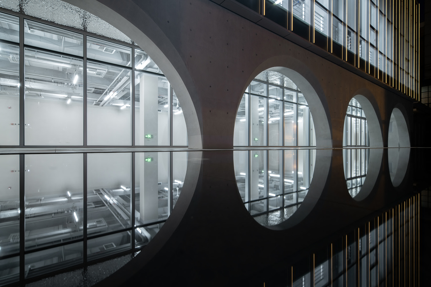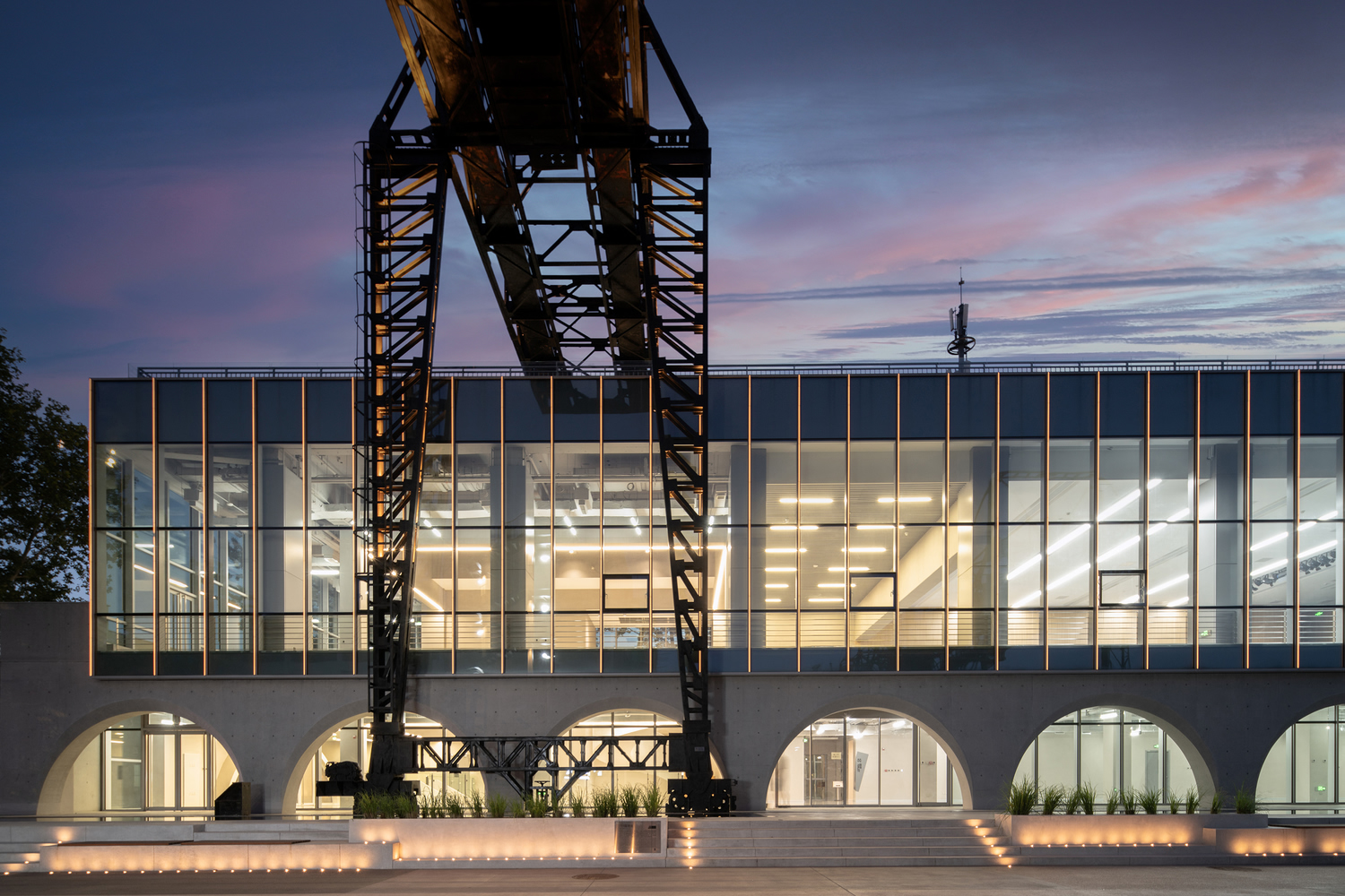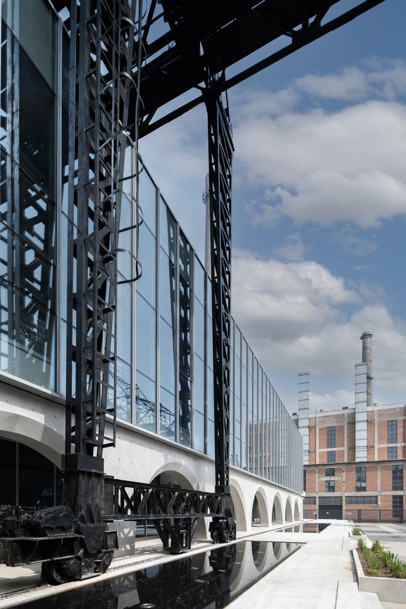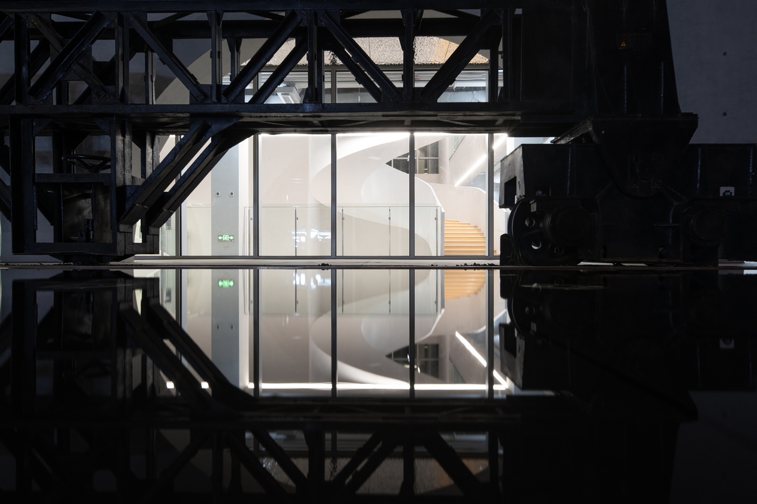 Large glass curtain walls and expansive skylights flood the interior with natural light while capturing panoramic views of the industrial relics outside. These reflections enhance the building’s sculptural quality and create a fluid, ever-changing relationship between interior and exterior.