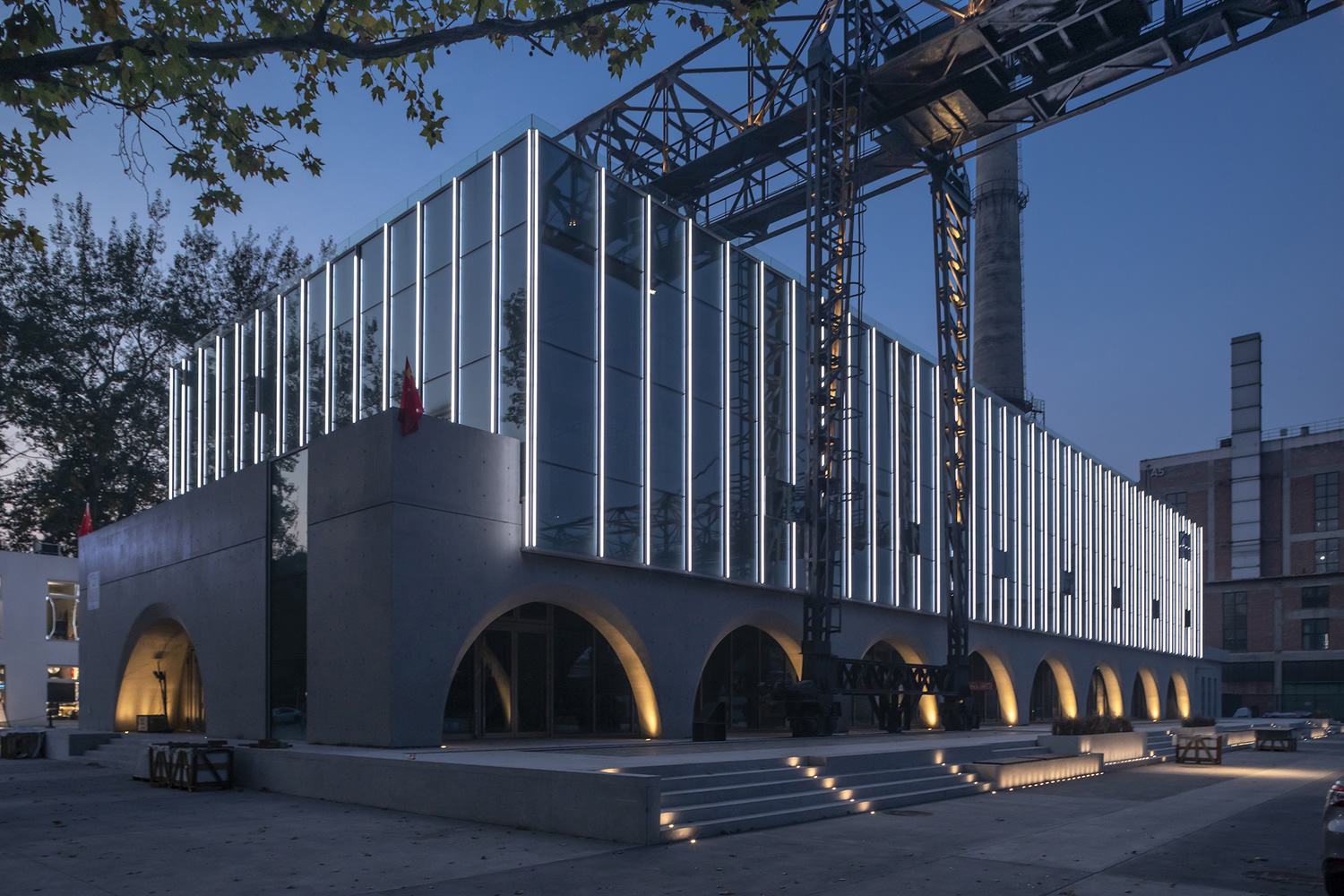 The Beijing 751 Library transforms an industrial ash pool into an open cultural hub, blending concrete arches, glass walls, and preserved machinery.