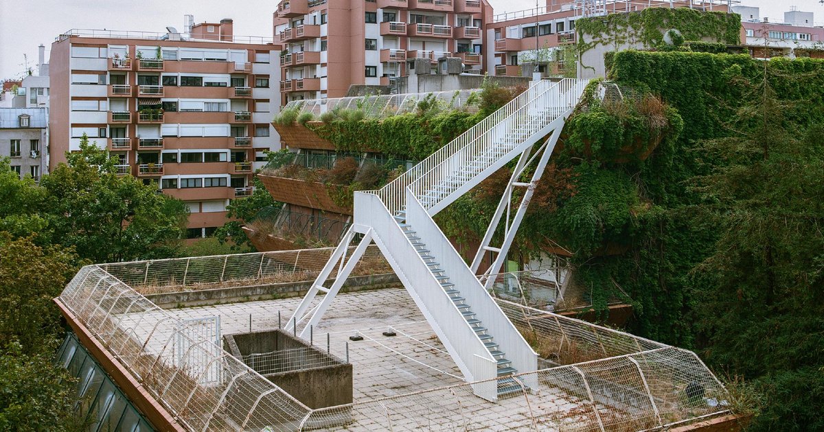 Linking two distinct areas, a two-flight staircase is constructed from a school whose facades are covered in vegetation. The white powder-coated staircase has a simple form that blends into the diverse environment. This useful and self-supporting object meets the need for lightness due to the low bearing capacity of the slabs it rests on. The aim is to create a strong element that stands out in the urban landscape. The lighting necessary to meet accessibility regulations is located in the stair stringers, giving it an almost ethereal appearance in periods without natural light.