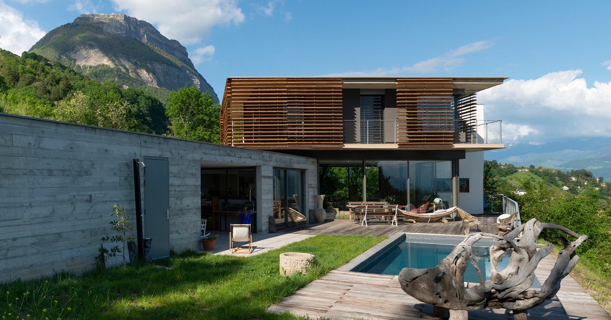 Bioclimatic house in Grenoble integrates hillside volumes, sustainable design, thermal comfort, panoramic Belledonne views, raw concrete walls, timber sunshades, and seamless indoor-outdoor living.