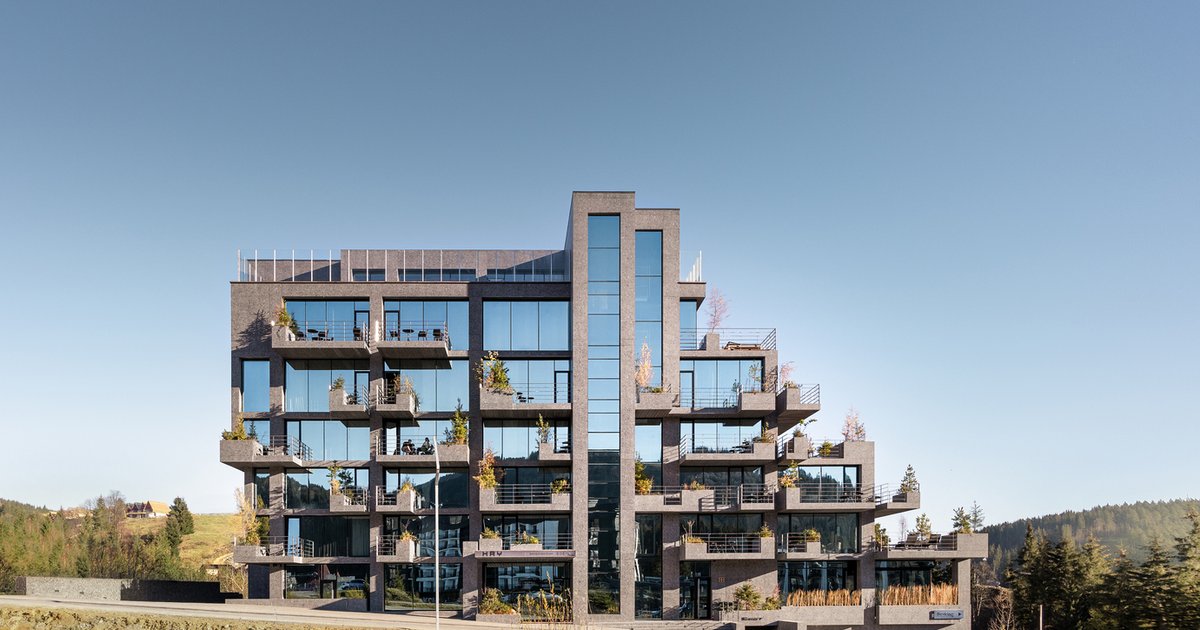 The hotel’s structure is designed to blend seamlessly with the Carpathian landscape. Each room offers a unique 360-degree view of the surrounding mountains, ensuring that every guest can fully engage with the stunning natural scenery. The building itself mimics a rock with cascading plants, integrating local flora directly into the architecture.