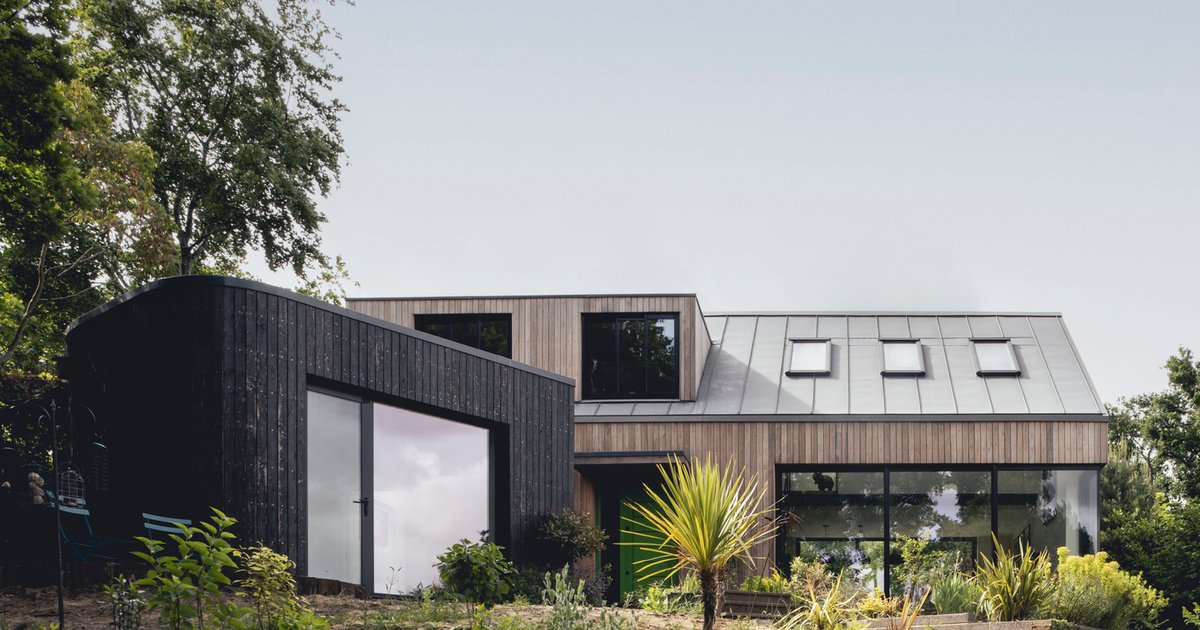Internally, the open-plan ground floor unites living, dining, and kitchen areas, accentuated by a bespoke steel and timber staircase ascending through a double-height void. The upper floor accommodates private sleeping spaces, while a unique 'pod' structure, clad in charred timber with a sedum roof, is connected via a glass link. This contrast with the main building’s natural larch and zinc façade creates a dynamic architectural dialogue. Exposed glulam beams enhance interior texture and emphasize structural honesty.