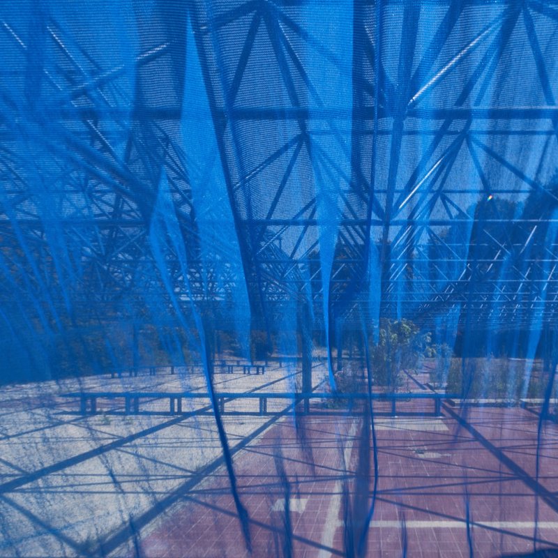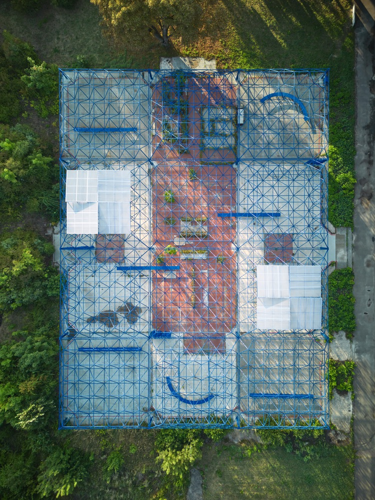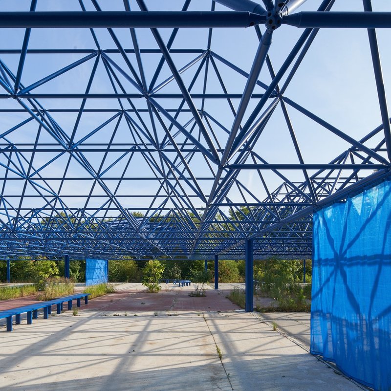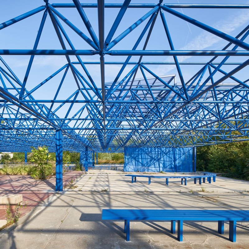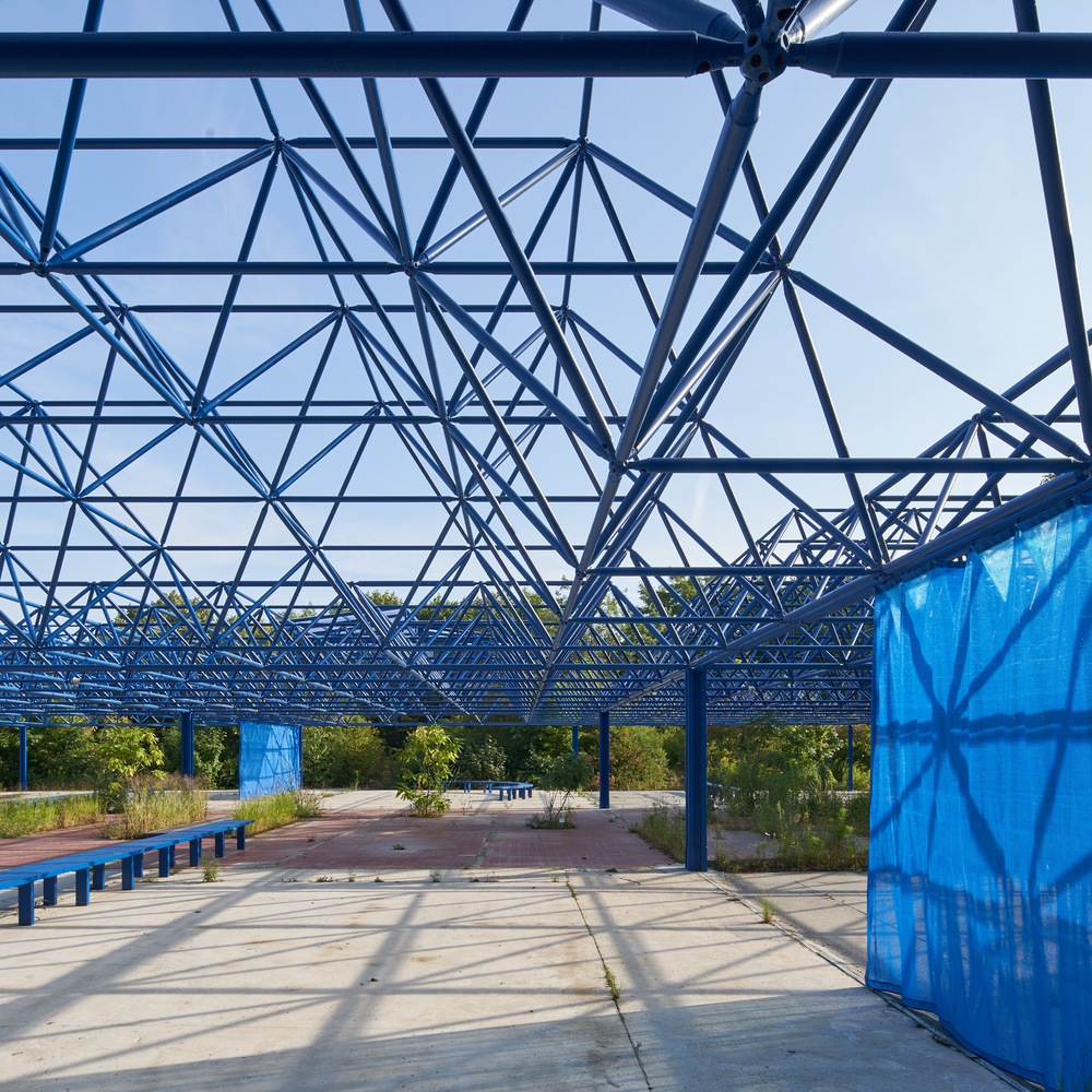 Modulorbeat’s intervention begins with the reuse of the existing MERO steel structure, a resourceful approach to sustainable architecture and adaptive reuse. The framework was reinforced for safety and coated in a striking gentian blue corrosion protection, a luminous hue rarely found in nature, making the structure both iconic and surreal.