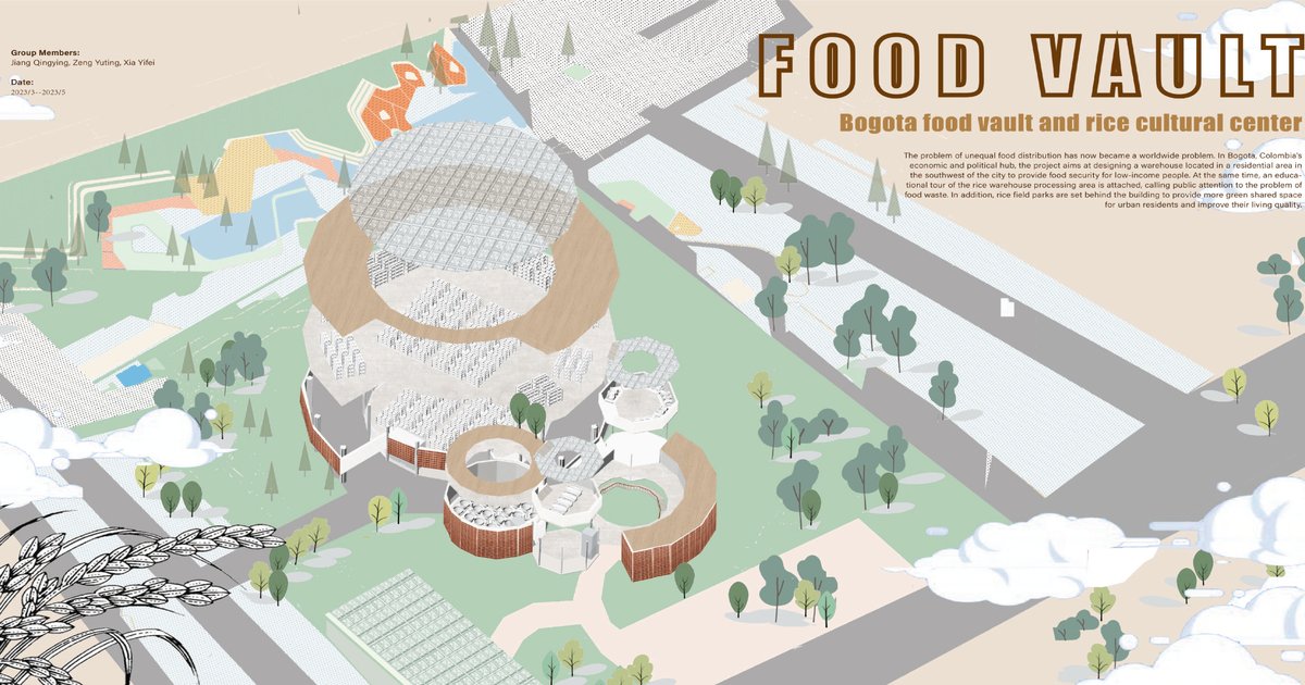 The problem of unequal food distribution has now became a worldwide problem. In Bogota, Colombia's economic and political hub, the project aims at designing a warehouse located in a residential area in the southwest of the city to provide food security for low-income people. At the same time, an educational tour of the rice warehouse processing area is attached, calling public attention to the problem of food waste. In addition, rice field parks are set behind the building to provide more green shared space for urban residents and improve their living quality.