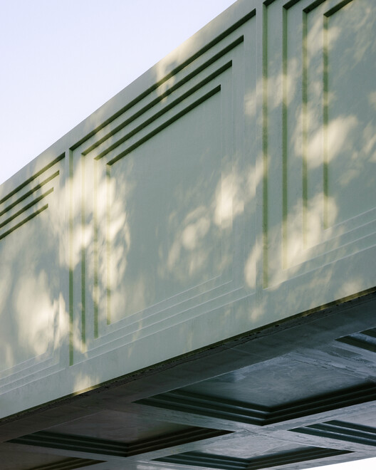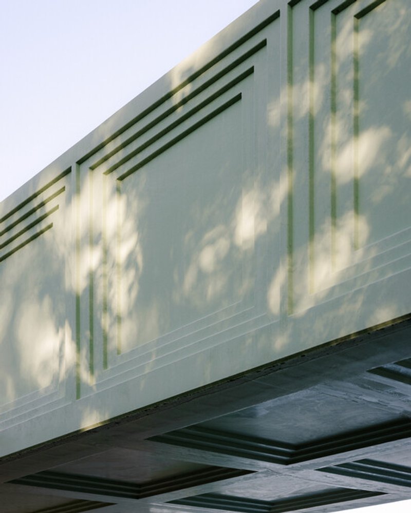 Despite strict budgetary boundaries, Oatmeal Studio turned constraints into creativity. A standard wall formwork system was reimagined to include reusable plywood “punches,” creating delicate, modular reliefs reminiscent of the Art Deco bridges in neighboring Pont-de-Veyle Park.