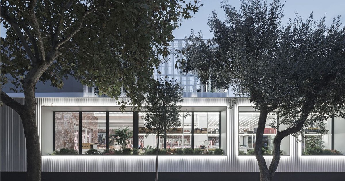 Above, a light metal framework filled with greenery enhances the store’s visual presence from the street, blending urban character with the charm of a traditional settlement. This addition not only balances the scale of the building but also introduces a living, dynamic layer that evolves with time.