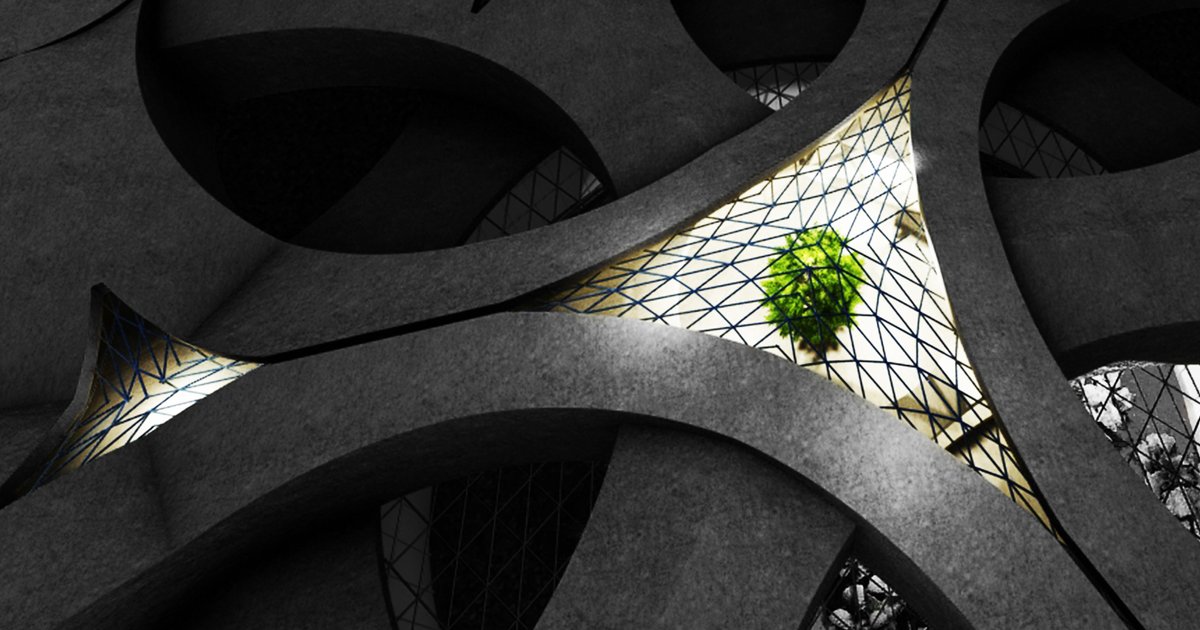 On the planet there are extremely harsh atmospheric conditions, there are strong winds, high cosmic radiation, also we have less sunlight than on Earth. Thus, the volume of the building had to be adjusted to them. Openwork form set on supports allows free flow of winds limiting the pressure of forces. Closed form without openings results in cutting off from dangerous for health radiation. Necessary access to light, which green zones need, was provided by the use of skylights.