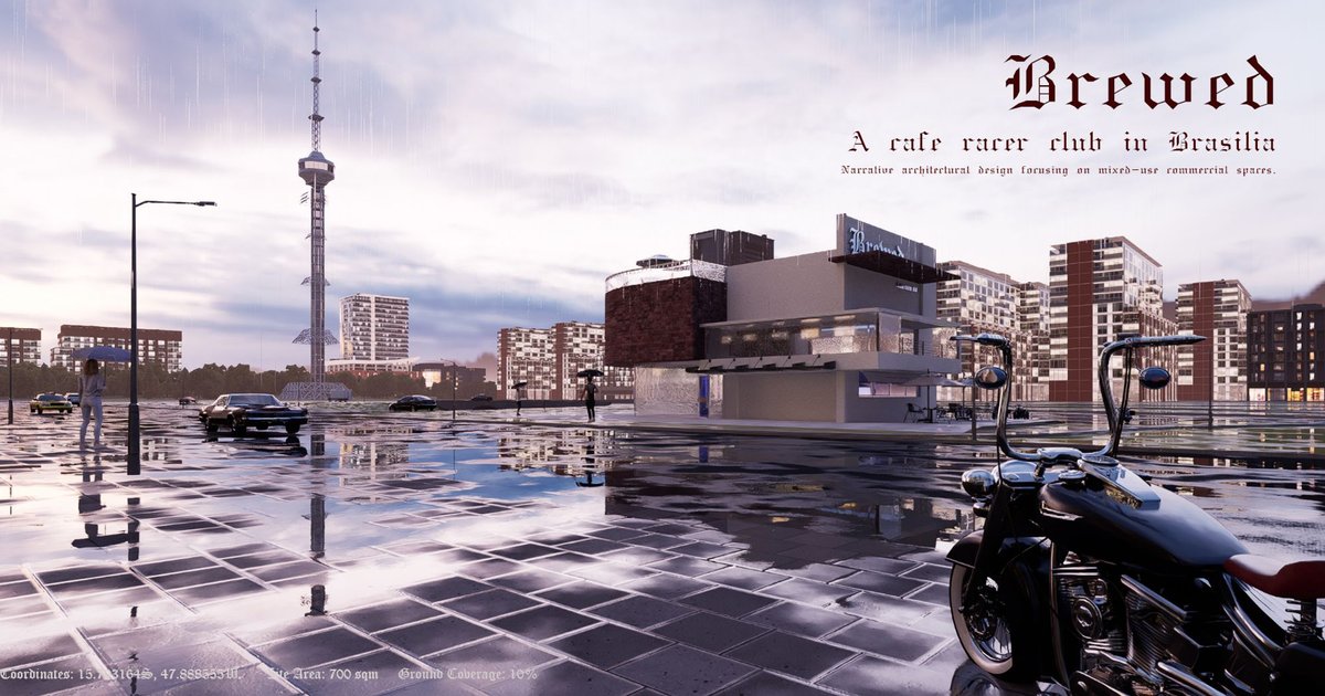 "Brewed" represents a successful fusion of architectural narrative, mixed-use design, and cafe racer culture. By creating a space that celebrates freedom, community, and the unique spirit of Brasilia, the architects have designed a destination that resonates with both motorcycle enthusiasts and those seeking a vibrant and engaging social experience. This project demonstrates the power of architecture to tell stories, foster community, and contribute to the cultural richness of a city.
