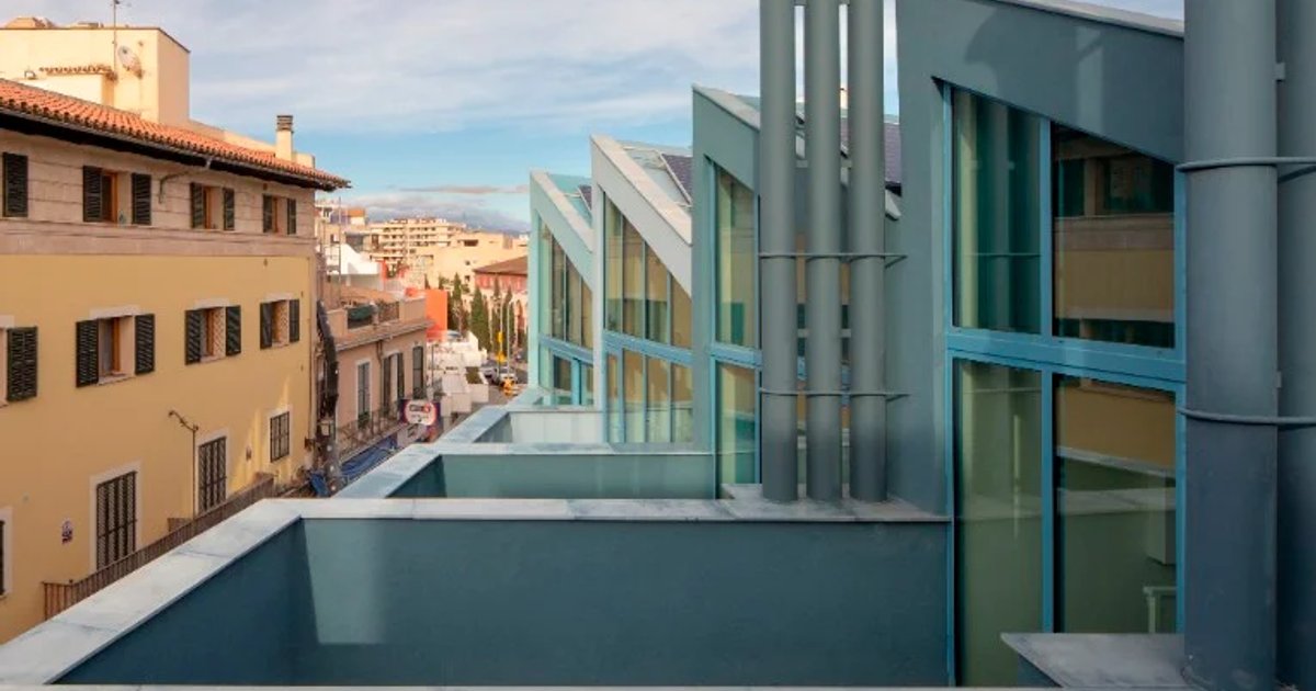 Located on a prominent street corner, the Gomila Center is home to a collection of energy-neutral buildings that utilize various sustainable practices. Across from the centre is Las Fabri-Casas, a set of row houses with a saw-tooth roof and blue ceramic façades. Behind these houses is a low-carbon apartment building made of compressed earth blocks, featuring a communal rooftop swimming pool with views of the nearby Bellver Castle. On the Plaza Gomila itself, there is the green building La Plaza, which is a transformation of an existing structure that now houses a historic bar, offices, and a communal rooftop with views of the bay and the cathedral. The Gomila buildings are designed with energy efficiency in mind, using principles similar to the Passivhaus standard such as high thermal efficiency and passive climate control measures like shutters and cross ventilation to minimize energy usage. To take advantage of Mallorca's ample sunlight, the rooftops are equipped with solar panels and heat recovery systems further reducing the buildings' energy consumption. Additionally, many of the materials used in the construction process were sourced locally to reduce the carbon footprint.