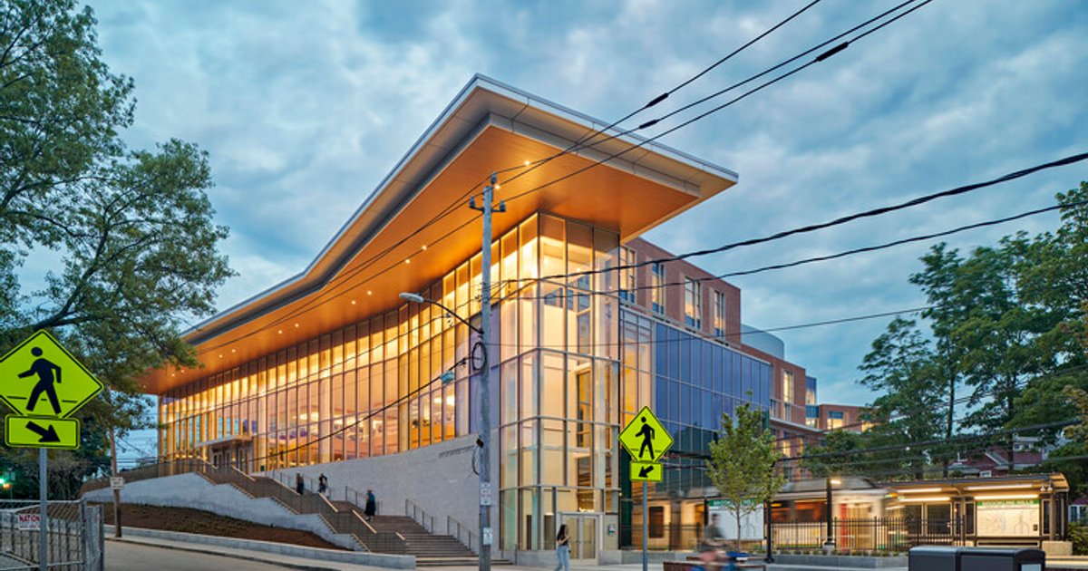 A transparent, civic high school building in Brookline that bridges infrastructure and landscape, fostering collaboration, visibility, and inclusive contemporary learning environments.