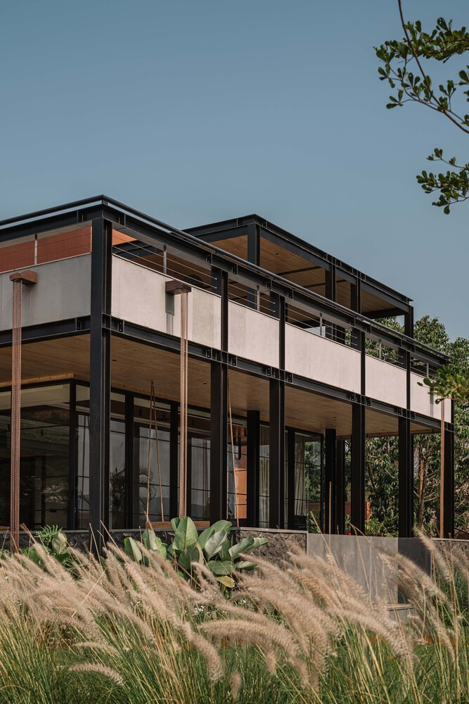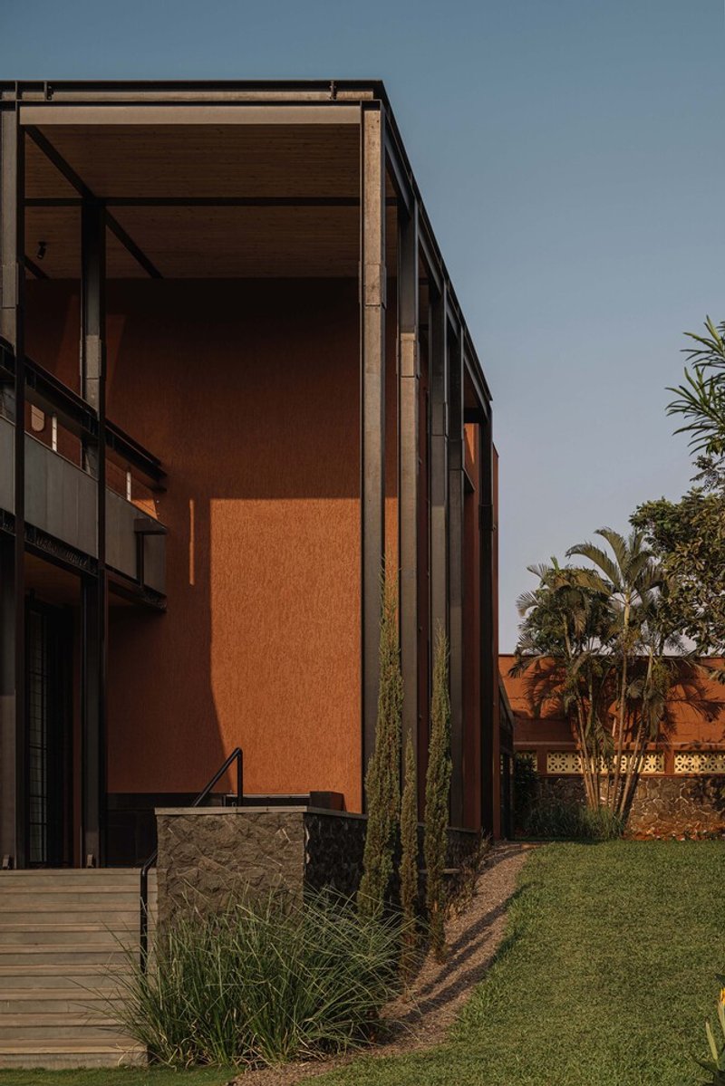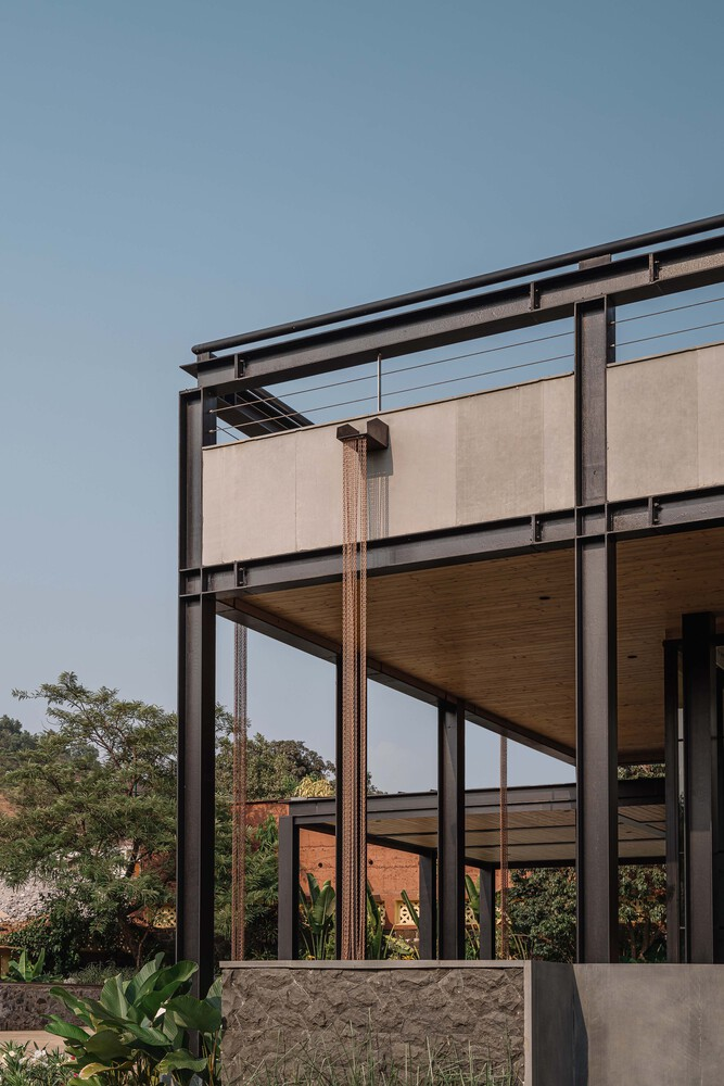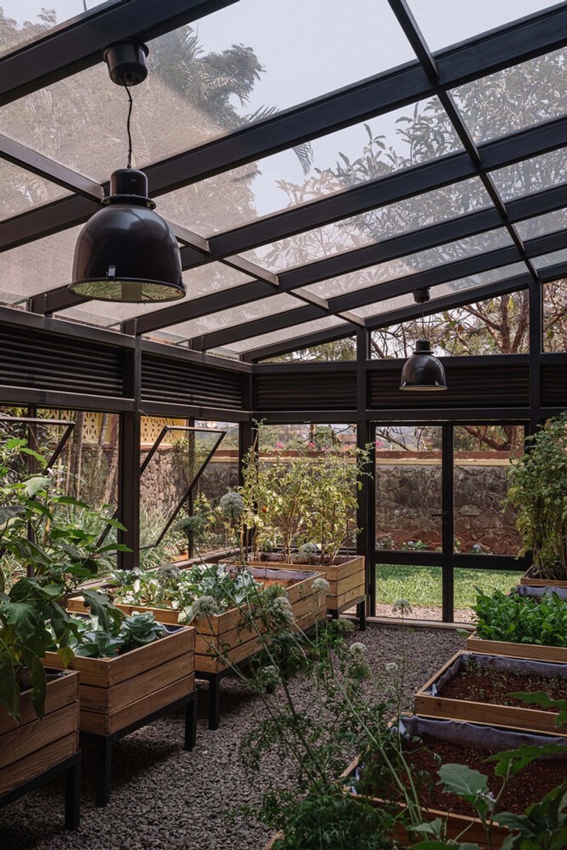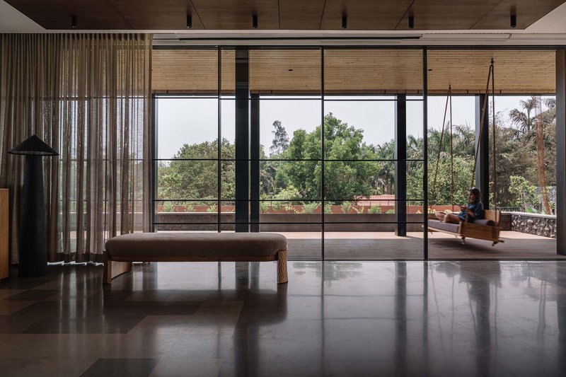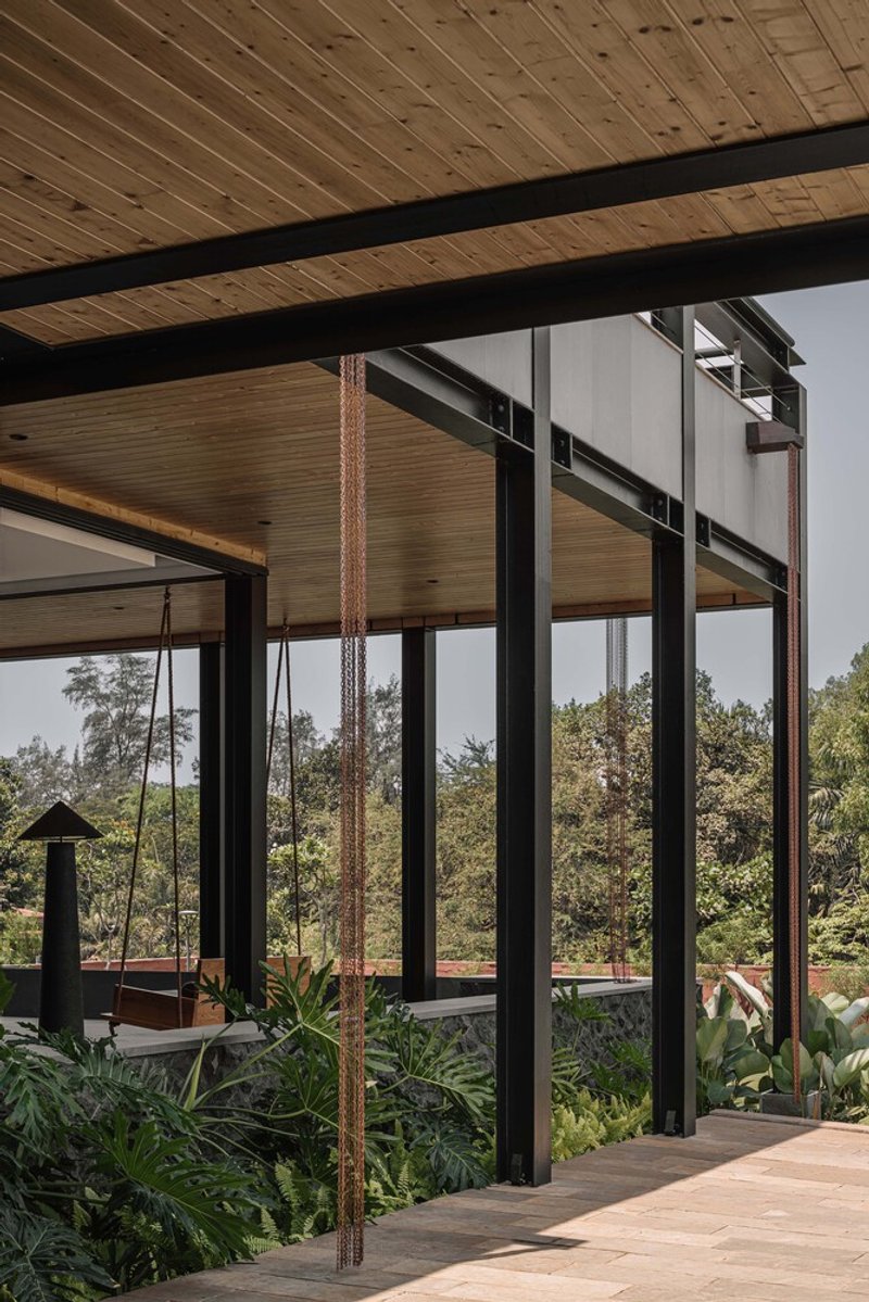 The addition of a greenhouse at the rear of the house creates a tranquil transition between indoors and outdoors. This glass volume introduces abundant natural light, enriching the internal ambiance and allowing passive cooling breezes to flow through. On the opposite end, the verandah and porch dissolve the boundary between the living room and garden, a nod to tropical architecture while remaining loyal to brutalist clarity.